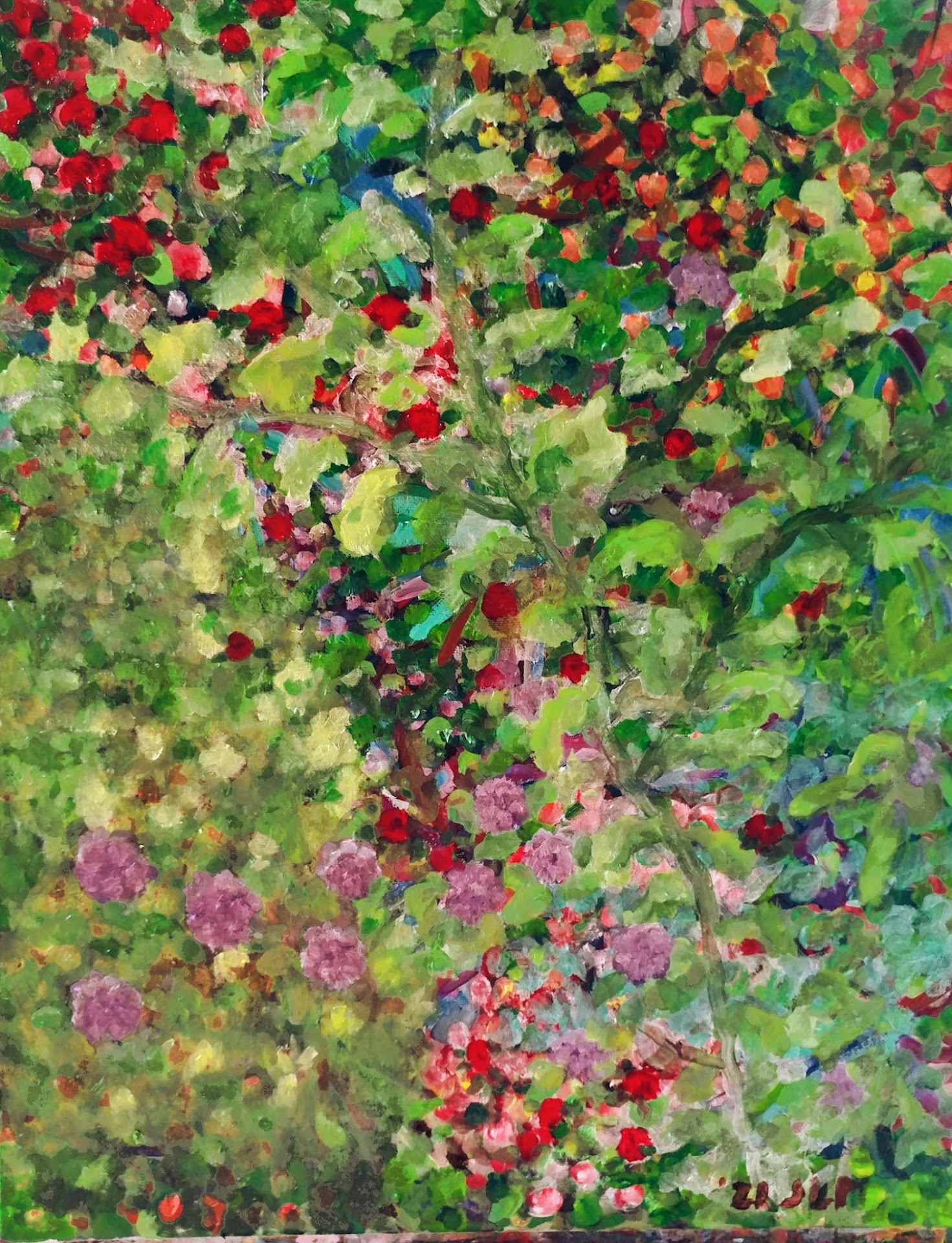 For Pete's Sake is a neighborhood restaurant. If you're visiting Philadelphia and want that Philly feeling, grab a parking spot wherever you can, and come looking for a table. The food is inventive and tasty, the beers fresh, and drinks, expensive like every other restaurant. Your meal won't cost more than $18.00 and probably a lot less. It's a comfortable, casual place, so you don't need a tie or high heels. Sit down and enjoy the Philly accents. Pete's isn't accessible for wheelchairs, although, if the weather is good, there are seats on the sidewalk outside. To get to the door, there are about three steps, and inside, to the normal height tables, there are another couple of steps. Diners are mostly young and youngish, often with young children, yet, in my 70s, I like it there.. Dinner is crowded and you might have to wait a bit for a table. Expect to drive around for approximately fifteen minutes looking for parking. Is Pete's worth all this? Well, maybe, depending on your mood. There are other restaurants in the area where the food is as good or better, but Pete's is a place that feels truly comfortable. It is exactly what it seems to be. Below is my 22 x 16" abstract oil painting of my garden. When I'm not eating, I'm painting...