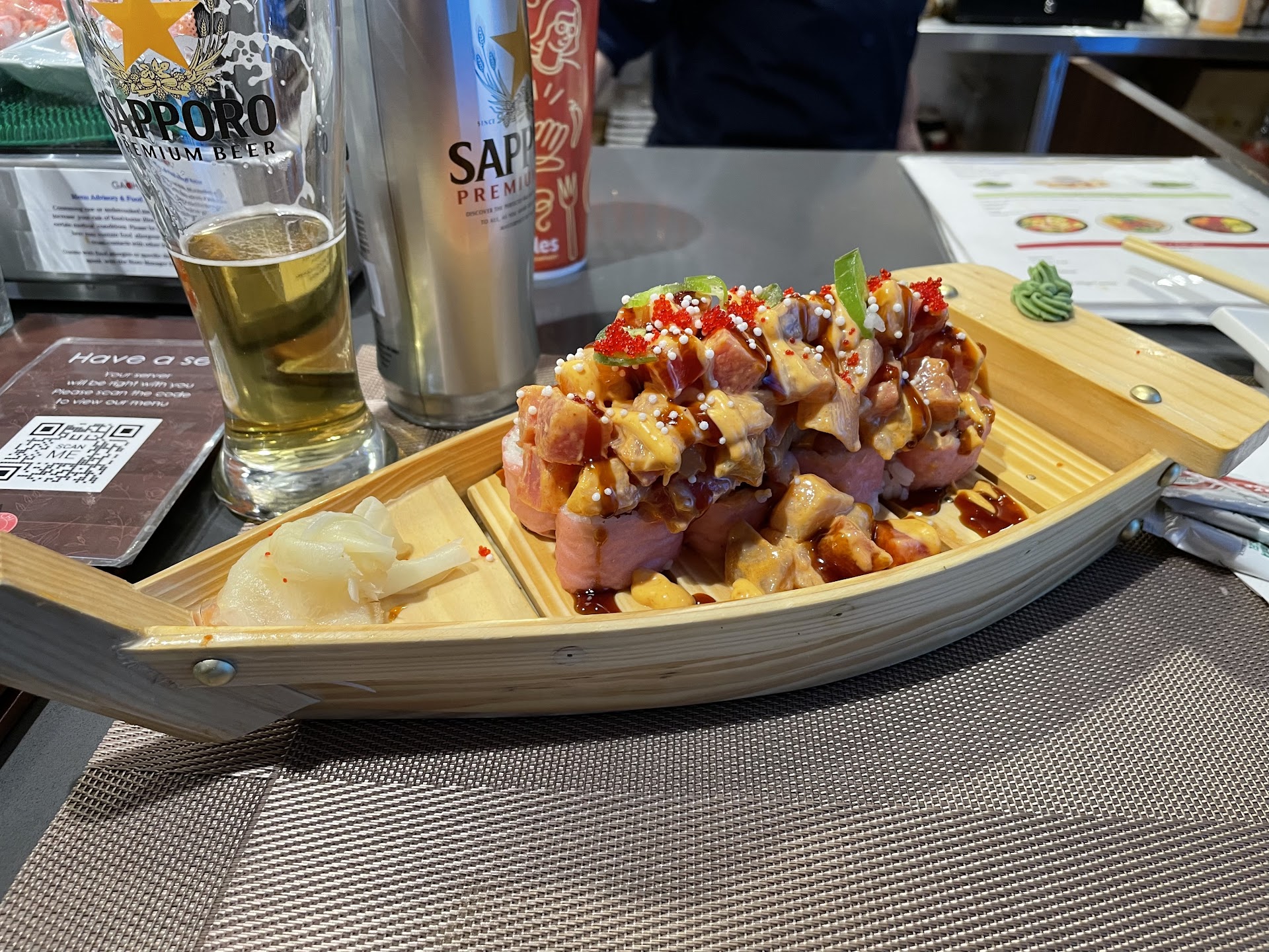 I am a sushi ho. I’ll take it anytime it’s offered and have had everything except from a gas station convenience store (yea, I actually saw that once). Pictured here is the Triple Delight and every little bite is absolutely delightful. With just enough kick to make you mouth tingle, this little boat to heaven is packed with yellowtail, salmon and tuna chunks, piled on a soy wrapped salmon avocado roll.