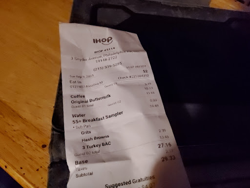 Good evening Google Family. I visited this location of IHOP for the first time today. I didn't even know there was an IHOP in South Philly. AJ suggested that we meet here. . AJ and I met in the parking lot and I gave him his birthday gifts in the car. He was not expecting it. HE was pleasantly surprised!!! He loved the Buff City Soap, especially the smell. I chose the Commando scent for him. He loved it!!!! Then I gave him his birthday cards in the diner. Miss LeeLee was our server and she was very efficient and nice. I ordered the same thing that I ordered at Bill's on Thursday. Grits, home fries and turkey bacon. Everything was so very good. AJ ordered buttermilk pancakes. AJ gobbled down his food so fast, before me. I thought I ate fast. AJ has me beat!!! AJ enjoyed his food as well. AJ loved his birthda cards. WE both enjoyed the fellowship and the food. The IHOP in Upper Darby has nothing on this one!!!! I will never visit that location again in Upper Darby. Even our server was talking about it when I brought it up, She didn't like it either. They offered her a job there and she said no. I don't blame her. I also ordered bottomless decaf coffee and orange juice. AJ just wanted water. We will definitely return here at some point in our lives. A great fellowship and eating experience. Good night Google Family, Workout, be healthy, fit...