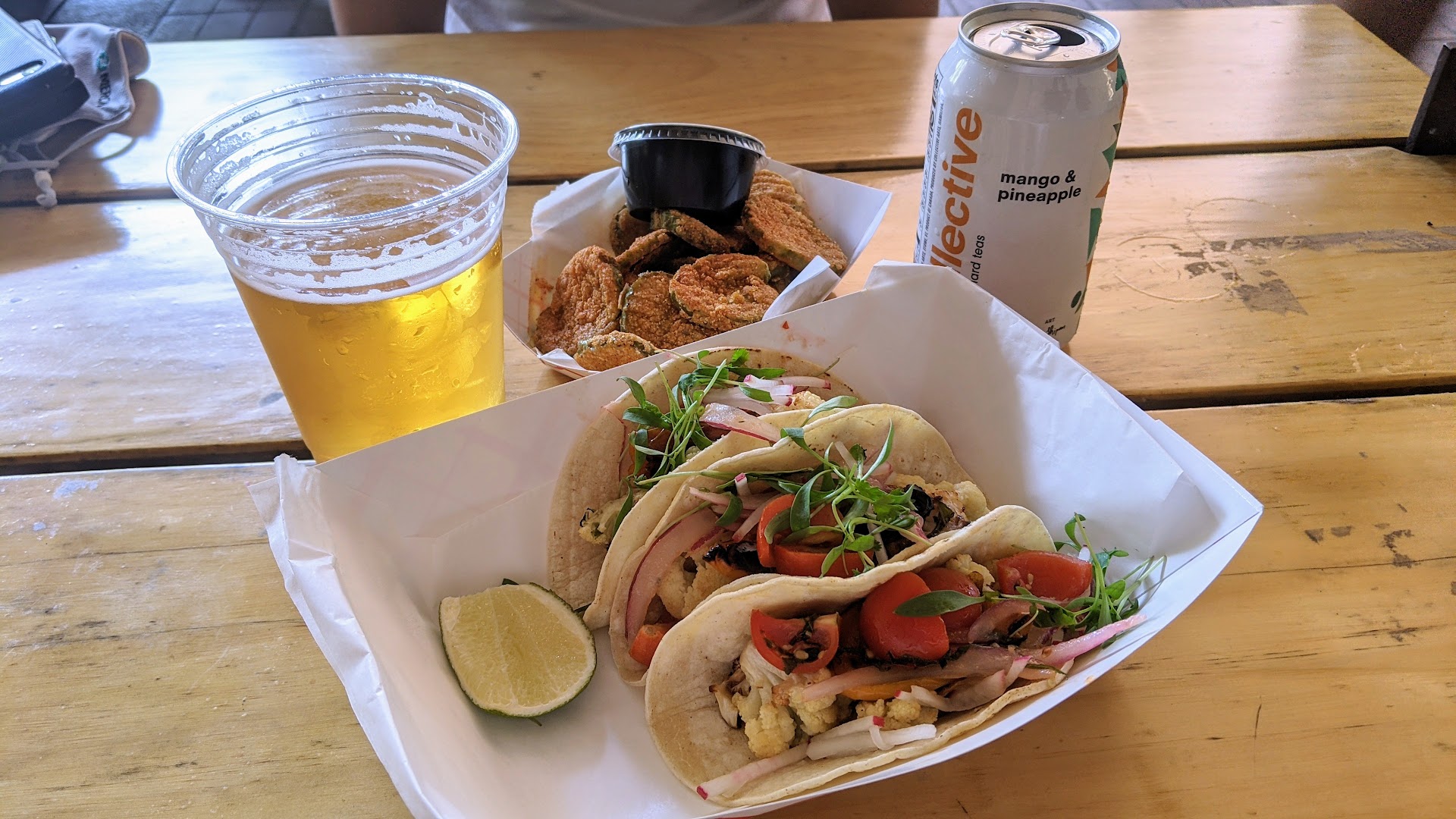 We ordered a first round of drinks and some light snacks - between two people we shared the cauliflower tacos and the fried pickles. Fried pickles claimed to be spicy but it was just paprika so they weren't "hot" spicy (which was good for me). The cauliflower tacos were surprisingly good! We aren't vegan, just wanted some vegetables in our life on the hot day instead of going with everything breaded, fried, and cheesed. The drinks were good - there was a wiiiide selection and you could definitely find something you liked on the menu.
