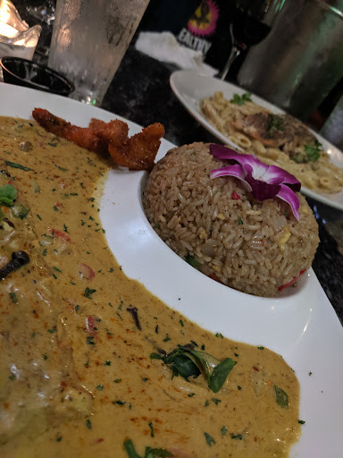 For the main entree, I ordered the curry salmon. Boy, oh boy, was that delicious!!! The sauce was the perfect kind of creamy seasoned blend. The vegetable fried rice was compacted into a separate portion of the plate into a neat circular mound with an edible flower on top that made the presentation look excellent.