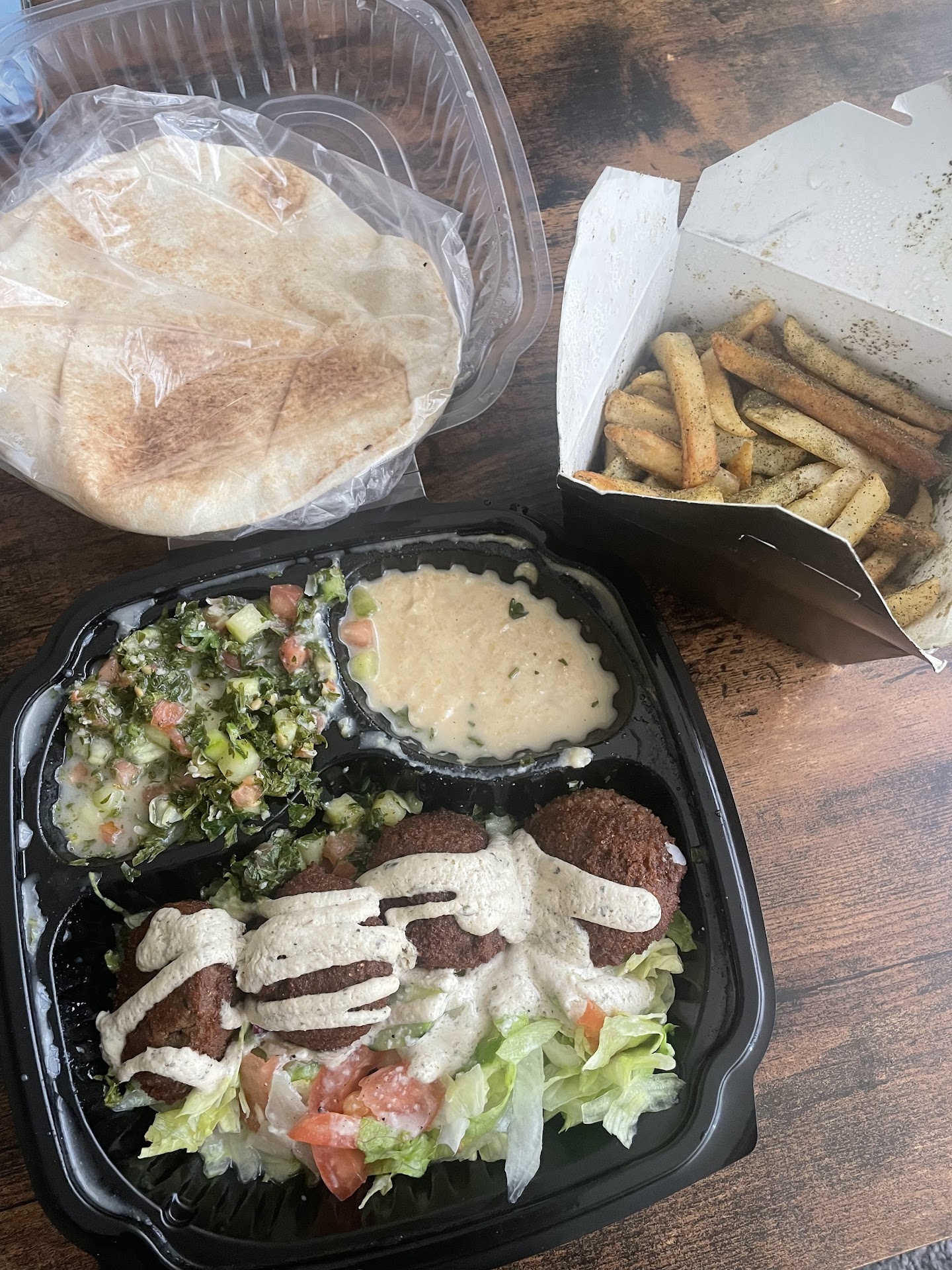 Falafel are well-seasoned, "meaty," and you get about 4-decently sized rounds with the platter. It also comes with delicately smooth hummus (hommus), tabouli (tabouleh for the algorithm), a basic chopped salad, and pita bread. The textures of everything are perfect together! You can also grab a sides like zataar fries which are PACKED with seasoning and fried with firm exteriors and soft interiors.