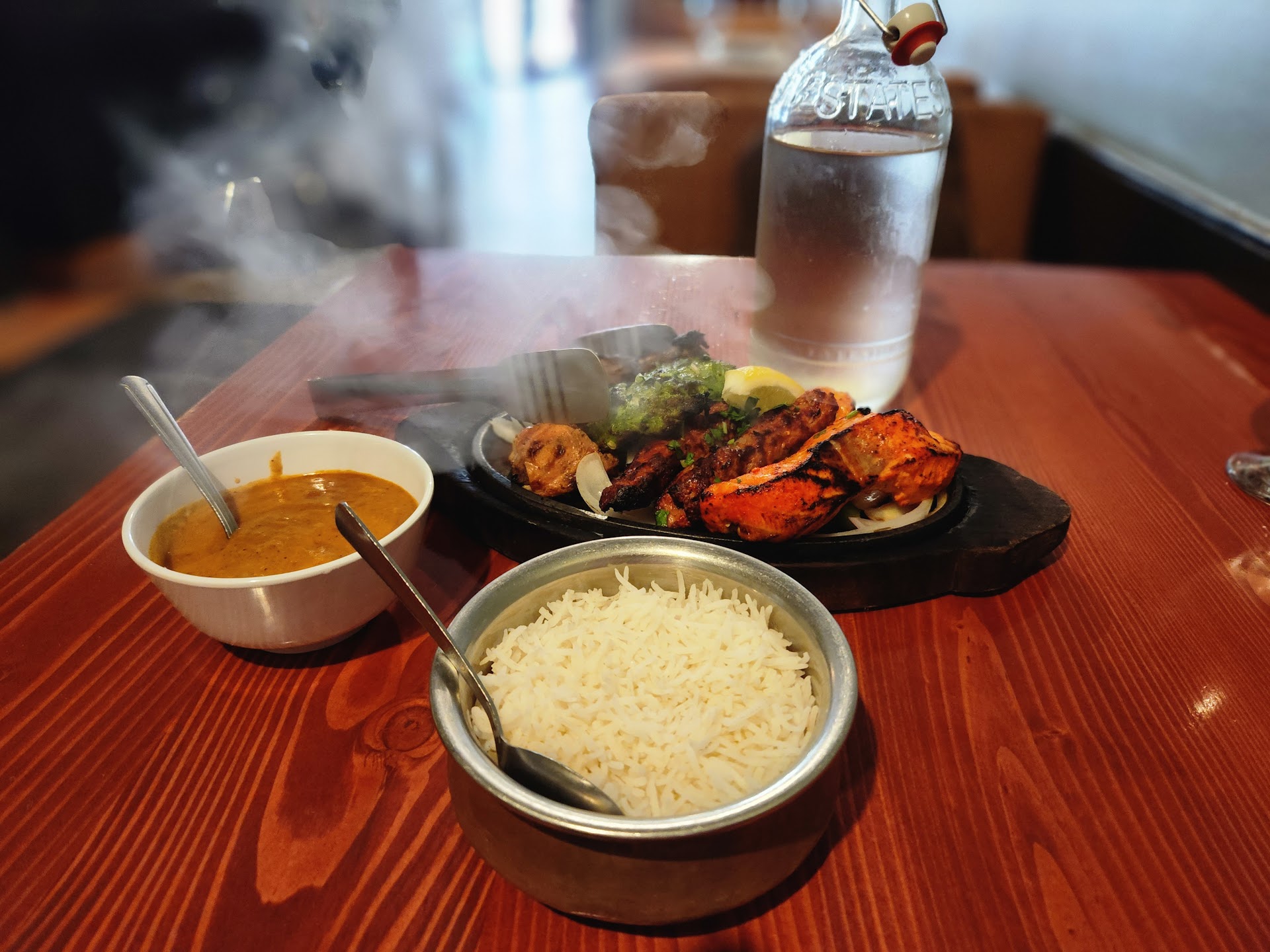 Great service, great decor, but food was quite poor. Constructive criticism: Dont overcook your chicken. It was quite dry and not pleasant to eat. Slow cook your curries so that the flavor actually sets into the meat. I am a cook and know what you did here. The chicken was cooked separately in a batch, rather poorly in both occasions. Then it was added to pre aliqouted curries. Tsk Tsk. Karma Your restaurant says authentic. I dont know a place where authentic means fake chutneys for samosa. My chutney should not be so bright green. Is that food coloring? That is not natural, please stop adulterating my food with it. Also, do you even make your own "sweet" chutney? Or do you just buy apple chutney and severely water it down. Either way, you need help here. I dont know if you remember which spices to put in the curry, but chicken muglhai calls for garam masala, cinnamon, bay leaves, amongst other things, yet all i could taste was cream and corriander, along with some yellow tumeric coloring to my fingers.