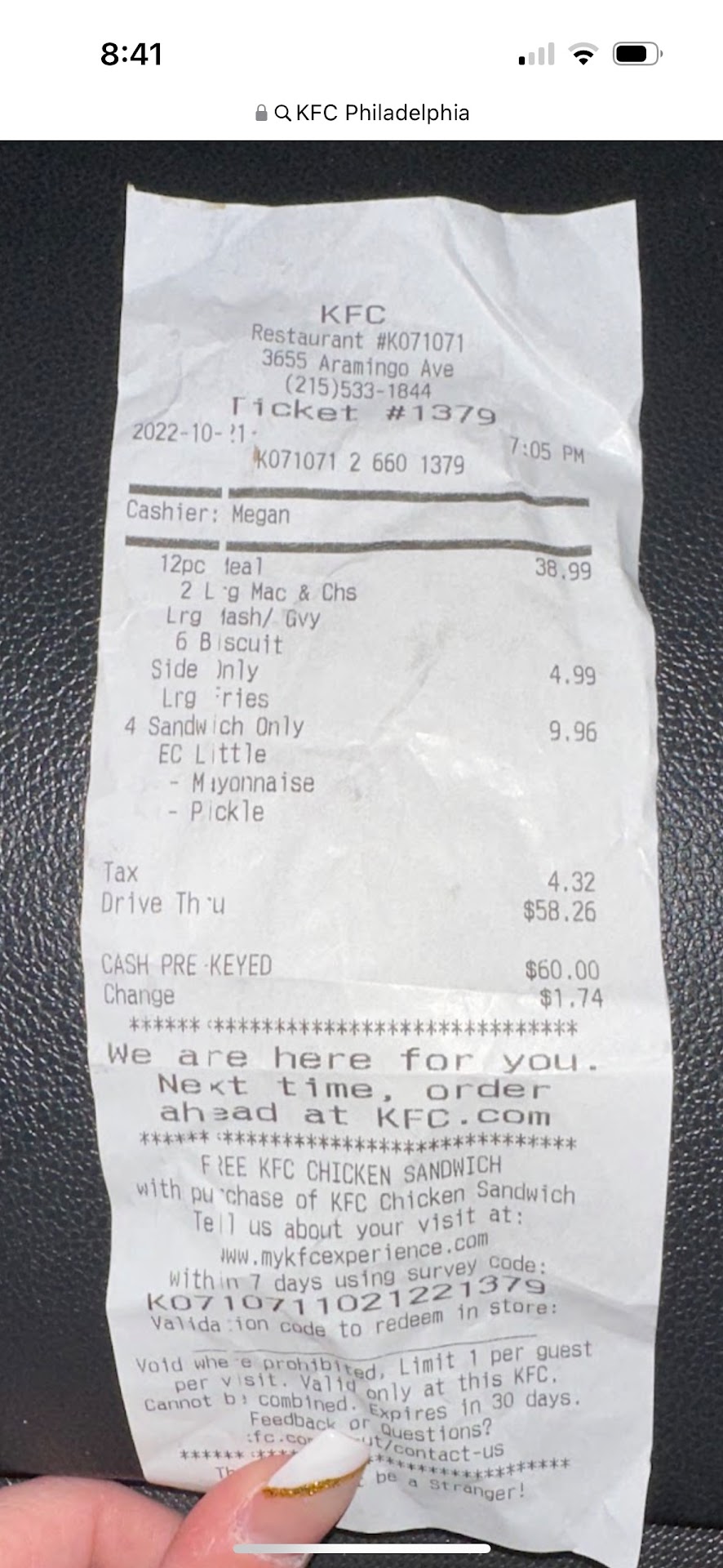Ā Ā Ā Read moreOctober 21st 2022 7pm me and my wife and 4 kids come here went through the drive through ordered 12pc family meal 2 Mac 1 mash and 4 plain chicken littles ..we get our food pull away my wife sees they for got are gravy and 1 Mac so I park she goes in and she explains to the lady in there how we are Missing a gravy and 1 mac the lady starts to say your not missing nothing I bagged ur stuff everything was there my wife texts me to tell me there not trying to give us are missing food then the lady just throws the food on the table at my wife ā¦I can say this ā¦this place is so unprofessional and disgusting..how can you think we didnāt get are food I only want what I paid for and it shouldnāt be a problem I have a big family 4 kids they all eat and need to eat what I pay for so I will always expect what I pay for ā¦I will never be coming back here for nothing after that situationā¦acting like you did tords a customer !! I hope this place goes out of business! Poor attitude...