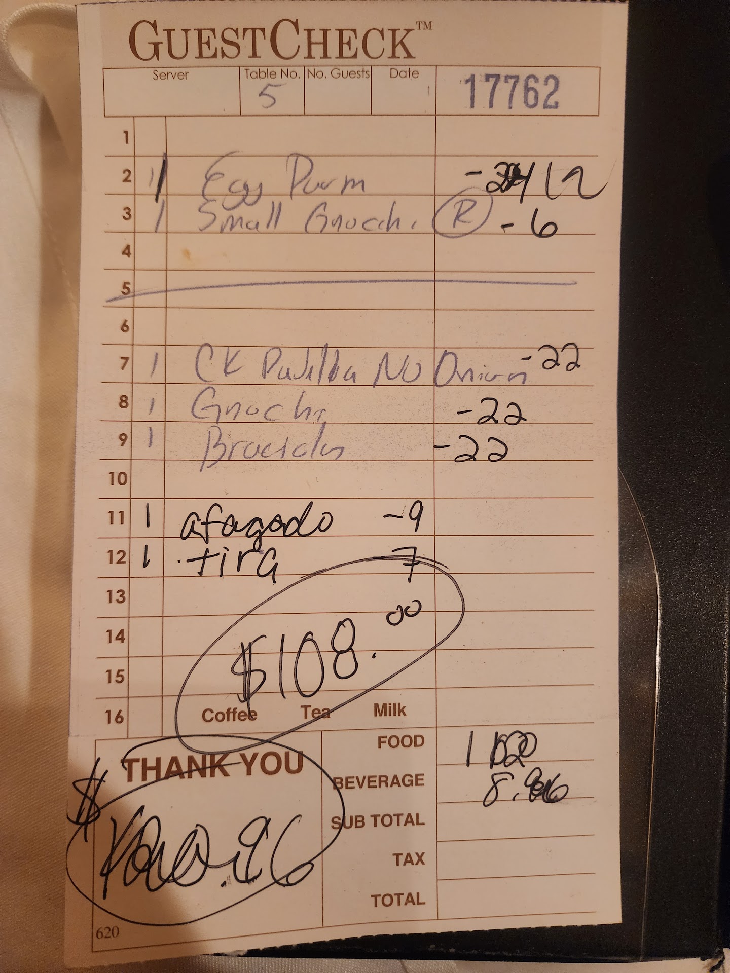 Read moreSat outside on a beautiful September night. We would’ve sat inside but they were full. I did make a reservation two weeks earlier but outside was the only availability. When I went inside to tell them that we have arrived no one approached me. I had to approach one of the waitresses. They told me to choose any seat I want outside. When we chose our seat and sat down, our server immediately approached us and we were off. It is a BYOB. So we chose our appetizers which our server recommended. We chose the grilled calamari as well as the smoked mozzarella. Both were outstanding. Then for our entrées, I choose Asobucco (it was a special.) the veal was cooked to perfection. It fell off the bone. The pasta was homemade and excellent. Would definitely recommend. The other entrée pictured was shrimp and lobster with linguine. It was also excellent. For dessert we chose chocolate mousse cake. It was very good. As far as the service it was very good. My only complaint is that we asked for bread several times before it was brought to our table. Like I said, in the beginning, we sat outside so I did not get a chance to review the inside. It is very small so make sure you make your reservations early. Parking is not easy as well. It is free street parking but not many spots available. Uber if you can. For four people, our bill...