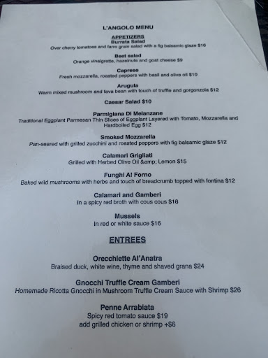 Read moreOur visit to L’Angolo before a sixers game started out a bit iffy. On a Tuesday we made a 5pm reservation for Friday at 5. It was the last opening and was made directly by phone. When we got there they had no record of the table. Luckily we were a little early and when I showed him the call record on the phone they found a place for us. At that point only one other table was occupied, 10 minutes later every one was full. After that minor hiccup everything was wonderful. The place is very homey and the service by committee was friendly and efficient. Being a BYOB is also a bonus. We started with mussels red. At $15 it was a huge portion and paired well with the delicious bread on the table. I had the beef braciola. It came with spaghetti but for a $3 up charge I got a big portion of large homemade gnocchi instead. My wife had the Pappardelle with shrimp and langostino. It had a nice kick and was delicious. We were very pleased with all the food and for the size and quality it actually felt like a bargain. The only area for improvement would for them to be a little more generous with the sauces. All the dishes had the bare minimum to cover the food with not a drop left when you got to the bottom. This was most noteworthy for the mussels since there was no sauce left to sop up...
