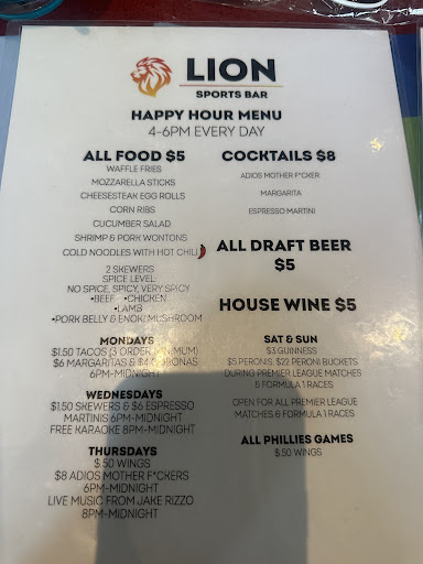 Con’s: it took FOREVER to get both food and drinks! It took so long that my appetizer, entree, and my beer (which I ordered before anything else) came out at the same time, and only after I ran down the waiter. This was a direct result of there only being one waiter working the entire restaurant! Don’t know if this is a normal thing, or just a mix up that day, but either way that’s unacceptable! I watched multiple people leave because it took too long to get their first drink (I was almost one of them). I would love to give Lion Sports bar another shot, but the wait to receive ordered items is a bit much...