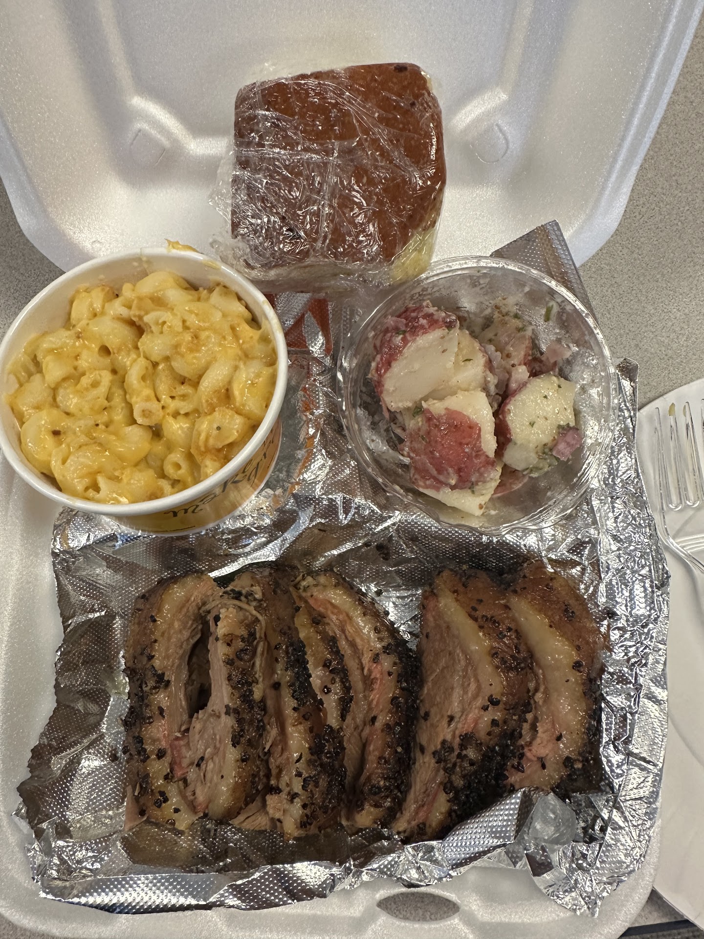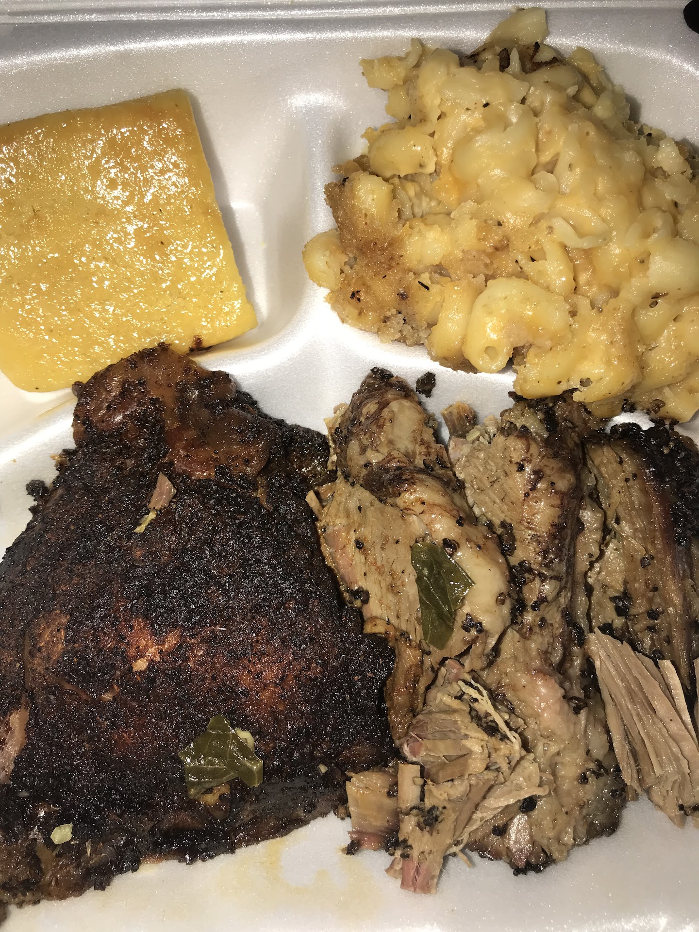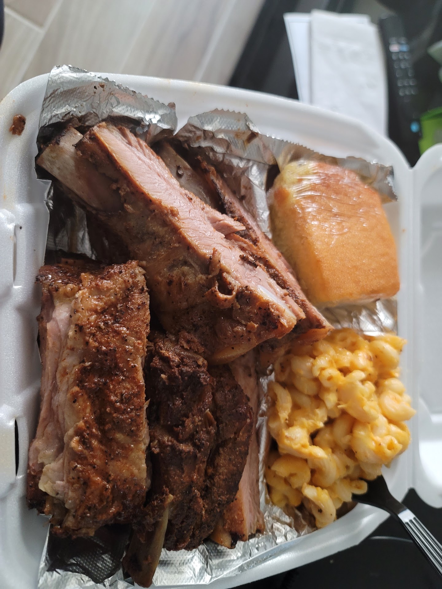 I ordered a Rib single platter with one side and cornbread. I liked that the sauce was on the side and not drenched over the ribs. That allowed for me to really get a good taste on the ribs. You can get a good pull on the ribs, they were cooked very well. I had the mild and spicy sauce on the side. The two sauces were pretty good. However, there is a particular taste (flavor) on the ribs that just didn't hit me right. They didn't lack salt, they do have a rub that has flavor on them, but one of those flavors really stand apart. 🤔.... I tasted the macaroni and cheese and to my avail, I could taste that same flavor. It's like a smokey flavor but not, if it makes any sense. As I tasted a little bit more, I think it's smoked paprika (I could be wrong) but that flavor profile is so overpowering. I honestly couldn't finish eating the platter.