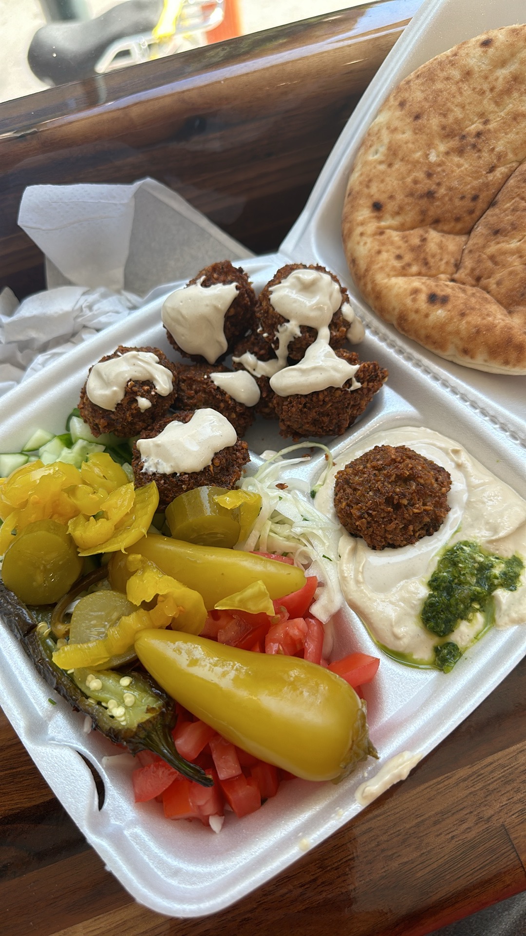 The falafel are always hot out of the deep fryer and the necessary condiments are constantly being refilled from buckets of freshly chopped cucumbers and tomatoes. The guys who make your sandwich are not only good-looking with exotic accents, but they assemble your meal like only a professional falafelist could. The slice, spread, dollop, scoop, 3 falafel, scoop, 2 falafel, squeeze of tahini...it's a process that makes you feel like you're watching a well-oiled machine. The only delay can be when you have to wait for more falafel to come out of the fryer, which in the end is even better because they are hot and greasy and even more delicious.
