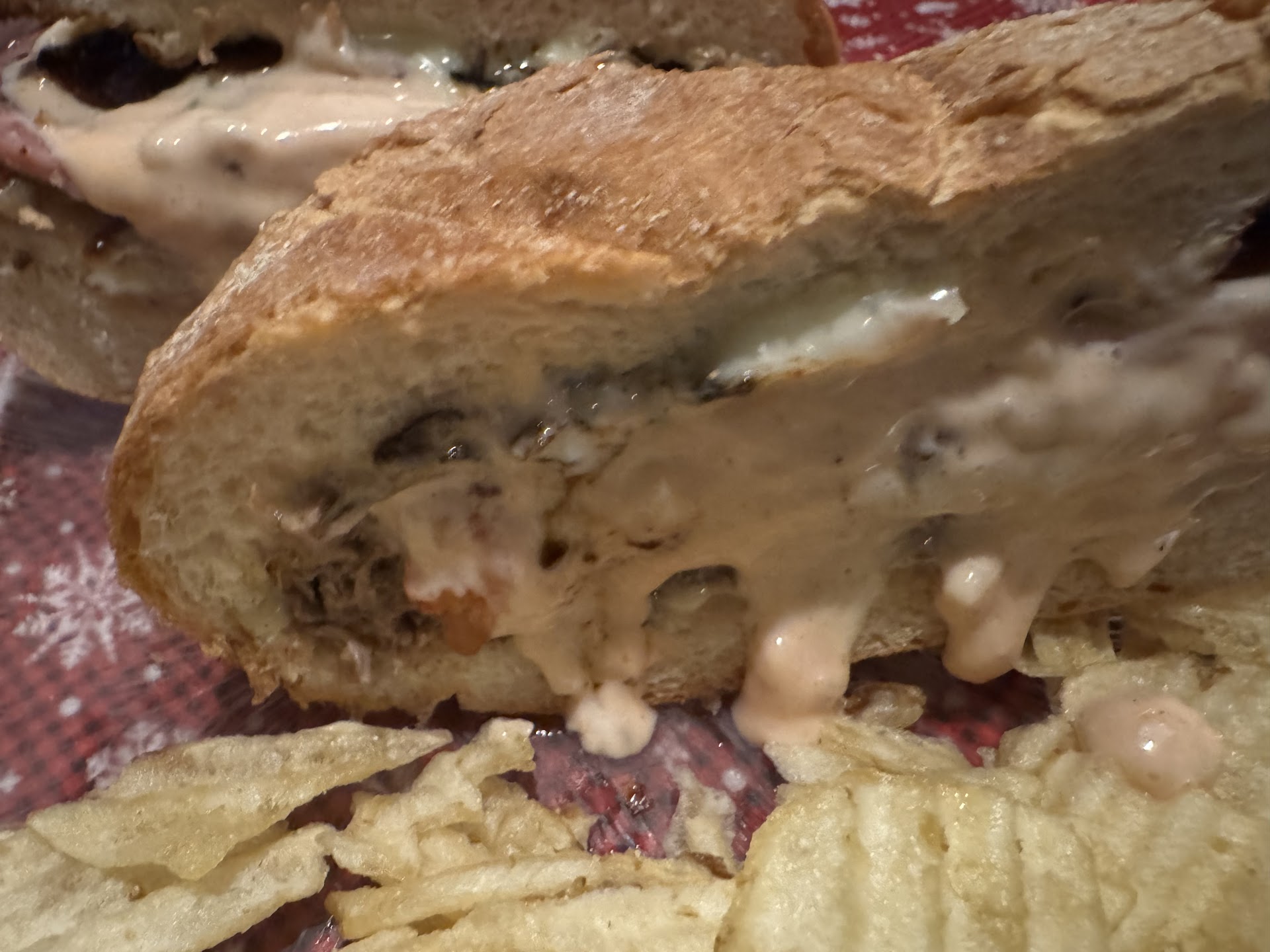 The Schmitter is a pretty odd sandwich honestly given what’s on it. Basically a cheesesteak with onions, tomato’s, salami, and their sauce that is similar to a Big Mac sauce. I’d never have thought to add salami to a cheesesteak, but here we are. The flavor was quite good, it was on a round Kaiser (you can order long roll if you want) which reminded me of donkeys place a bit, and the tomato added a nice freshness as well. The price is what you’d expect, maybe a tad bit more, for the sandwich and it comes with basic ridged chips.