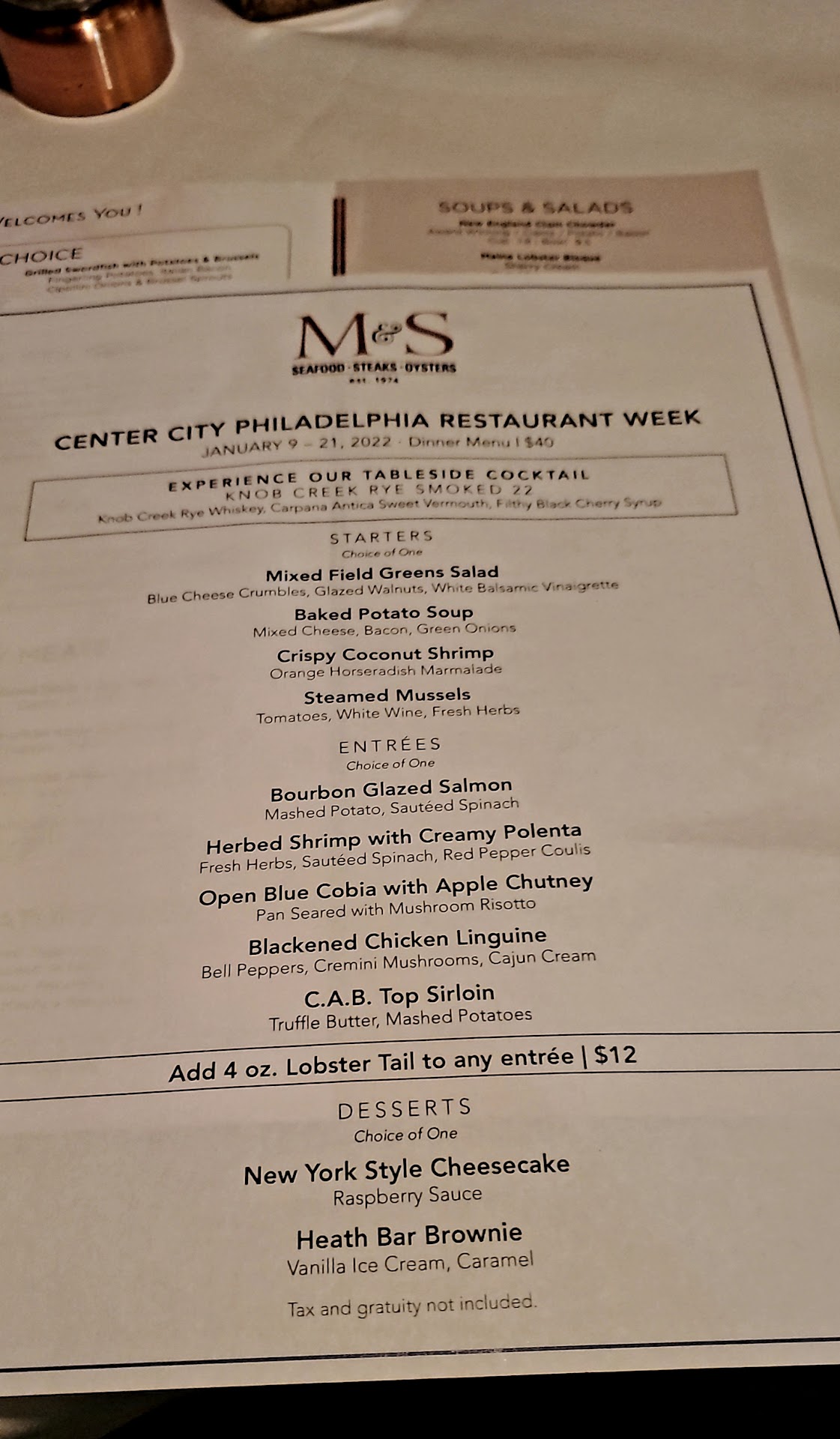 This place, despite being in the heart of center city where one would expect top notch food and service, was a complete disappointment for our Thanksgiving dinner. If I could give no stars, I absolutely would. To start, we ordered an assortment of oysters, some of which were barely the size of a quarter, but came with no small fork to loosen them with, which is customary in fine dining establishments, one of which M & S claims to be. When we asked our server, Gwen, about this, she told us people just usually use their regular utensils. Ma’am what? Oh okay. At this point, I would have to agree with a previous reviewer, Mr. Snoots, who said it was like being at a glorified Red Lobster because things just went from bad to worse without the comfort of warm cheddar biscuits. My cherry Moscow mule was so watered down, like at most chain restaurants, but for $13 I expected to actually taste the vodka. Gwen said “of course “ when I asked for an extra splash of Tito’s, but later came back to inform me that the “manager said the drinks are pre measured.” Nothing more. So, we sent it back. My butternut squash soup appetizer tasted like “would you like some squash with your cream?” There was no distinct squash flavor and it lacked seasoning so I added salt at the table. Next, we decided to drown our underwhelming oyster experience in some fried calamari that never arrived because Gwen, bless her heart, forgot all about it and simply brought out the entrees. The bone in angus rib-eye my husband ordered was by far the best thing on our table. He ordered it medium rare, I believe, which was a good choice. His $6 lobster mashed potatoes , however, were just regular bland mashed potatoes with 3 lobster bits on top. I’ve had better mashed potatoes at Golden Corral. The a la carte spinach was disgusting. It was wilted, sour and looked like it came from a frozen bag. After we sent it back, Gwen sheepishly tried to replace the spinach with “the freshest one” she could find, but we were not interested . This also tells me that somebody recognized the sad quality of vegetable they tried to pass off on us initially. Horrible. Poor Gwen had already told us that she was new to the restaurant (there’s a “We’re hiring. Apply online.”sign at the front desk) but this whole evening just underscored her inexperience and the lack of customer service and support from management. We had to continually ask her to clear our dirty dishes. I didn’t see her forgetting to do so at any of the 3 other tables she served nearby. She did not check on us nearly as frequently and we had to constantly flag her down. My meal was nothing special, sort of like something from a hospital cafeteria. The gravy was the best thing on the turkey. The sides: green beans, corn bread stuffing and apple squash mash were basic, just not worth $32. My mashed potatoes were bland and lumpy (which I wouldn’t have minded had they tasted like anything to begin with). But I was so hungry by then and where were we going to go at 7pm on Thanksgiving day at the last minute? We couldn’t wait to get out of there so when the check came, we were all set until we saw the $13 drink we sent back still on the bill. When my husband went to the manager on duty at the hostess desk (possibly Jennifer Bucci according to other reviews?), she asked him what was wrong with the drink as if hearing it for the first time. So he went over it again. She never apologized for the inconvenience or misunderstanding. She simply proceeded to hand him a new check while he held the billfold in his other hand. Her attitude was completely unprofessional as she went from cavalier to aggravated and then snatched the bill from his hand and proceeded to add it to the billfold as she should have done in the first place. Needless to say, we will not be giving M&S any more of our hard earned money on any day in the future, let alone a holiday. This restaurant is less than mediocre and management should be ashamed of themselves. It’s an utter disgrace to even mention this business in the fine...
