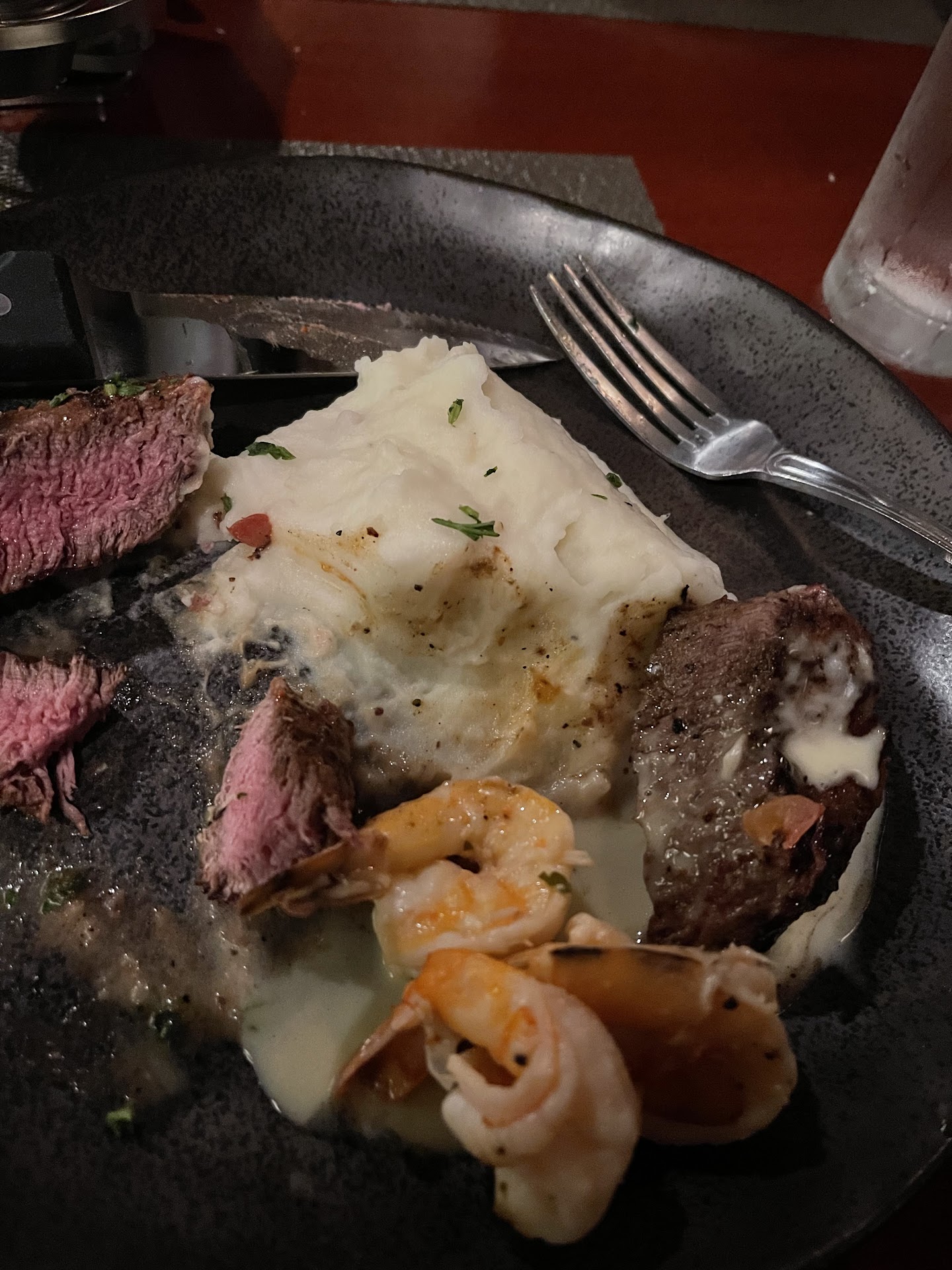 My entrée was Bourbon Glazed Salmon with mashed potatoes and sautéed spinach. I've never had salmon that looked to be flattened like a chicken cutlet and it was overcooked and dry. This piece of fish was too small to be overcooked, how did the chef allow this to happen? One of my friends had the same exact order as mine and hers was also the same way.