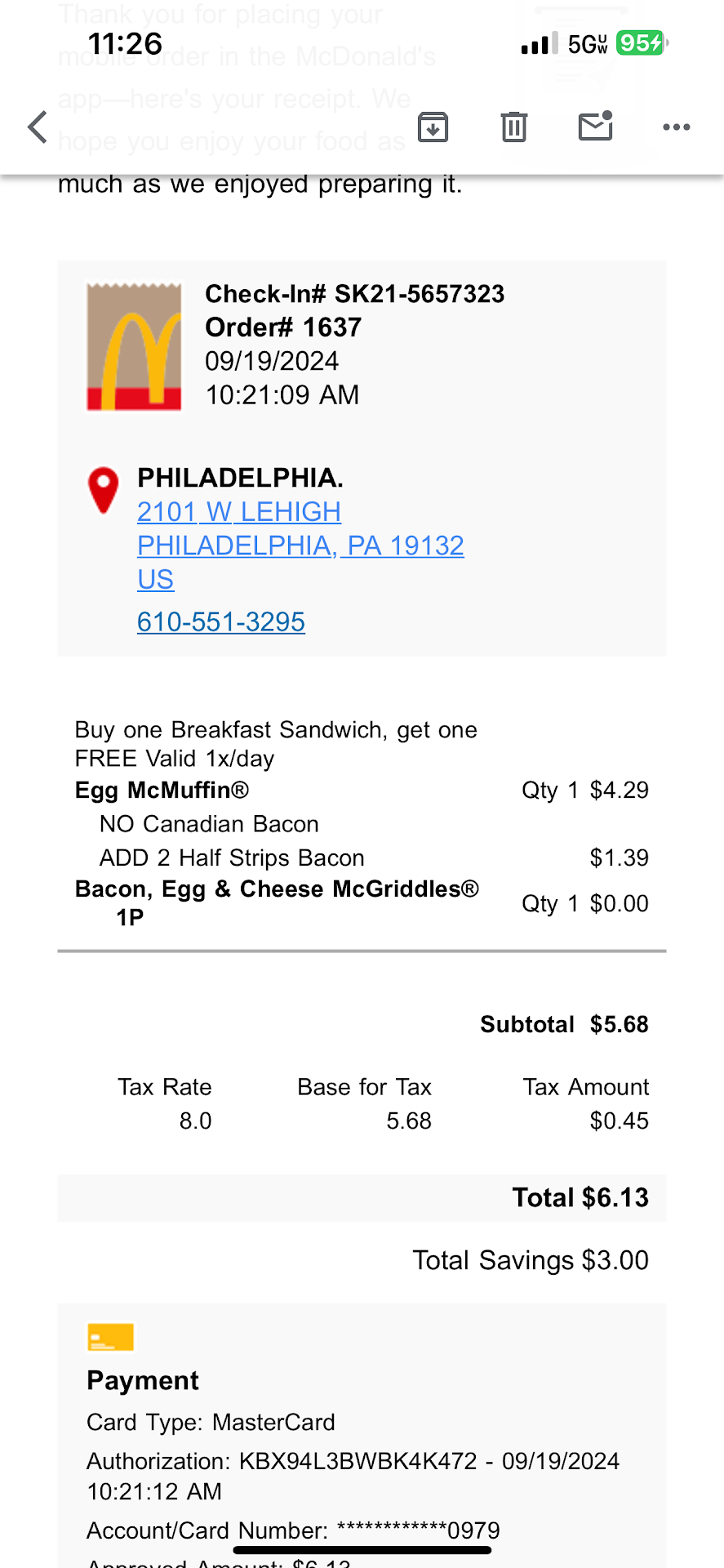 I experienced the worst demonstration of service today your north Philly location on Leigh ave. . The expo (sierra) lacked professional courtesy and class. I ordered through the app. It was close to lunch but the app won’t let you order lunch if it’s breakfast time. I ordered at 10:21. An hour later the LINE COOK (which she called a few names in front of the clients because he walked out the door for a moment) comes and asks me about my order number. The expo then chimes in after ignoring everyone (including me) in the front for so long unless they were cashing out (to include some career applicants). I get being short staffed and I get being in the weeds / slammed. If my ticket number came up and you didn’t have the items then simply address it. If you ignore it then how would I know? Once they (the workers) spent minutes looking for my order, the expo asked to see my order (while saying they been called that number…. They hadn’t they called 1670 and never 1662) and then sees that I have a breakfast order and says aloud that we don’t have that because that’s breakfast. Get your money back through the app and walked away. I absolutely loathe when people are rude without cause. I was resoextful and patient. I know the business so i was giving them grace. If you missed an order then say that. It’s $6. But my time is valuable and I have a job to get to. I renivate houses in philly i oay for my qorkser to oatronize thus location. Not after today! Ill order in for sure. On a PR side: The expo had no belt on (had to continuously pull her pants up in front of the clients), had a dirty gold head covering (that the clients were also talking about, had no gloves on while opening/filling the orders (which the clients were also talking about). She sounded efficient with her volume but perhaps that level of efficiency missed me today. A simple apology and handling me better for standing there so long would’ve gone a complete different direction. I would’ve reordered and all would’ve been well but when you make a scene now attention has to be brought to the subpar disposition. I pray this location has some training updates and also has better quality applicants who take pride in service to others. We all know it’s fast food and it’s north Philly...