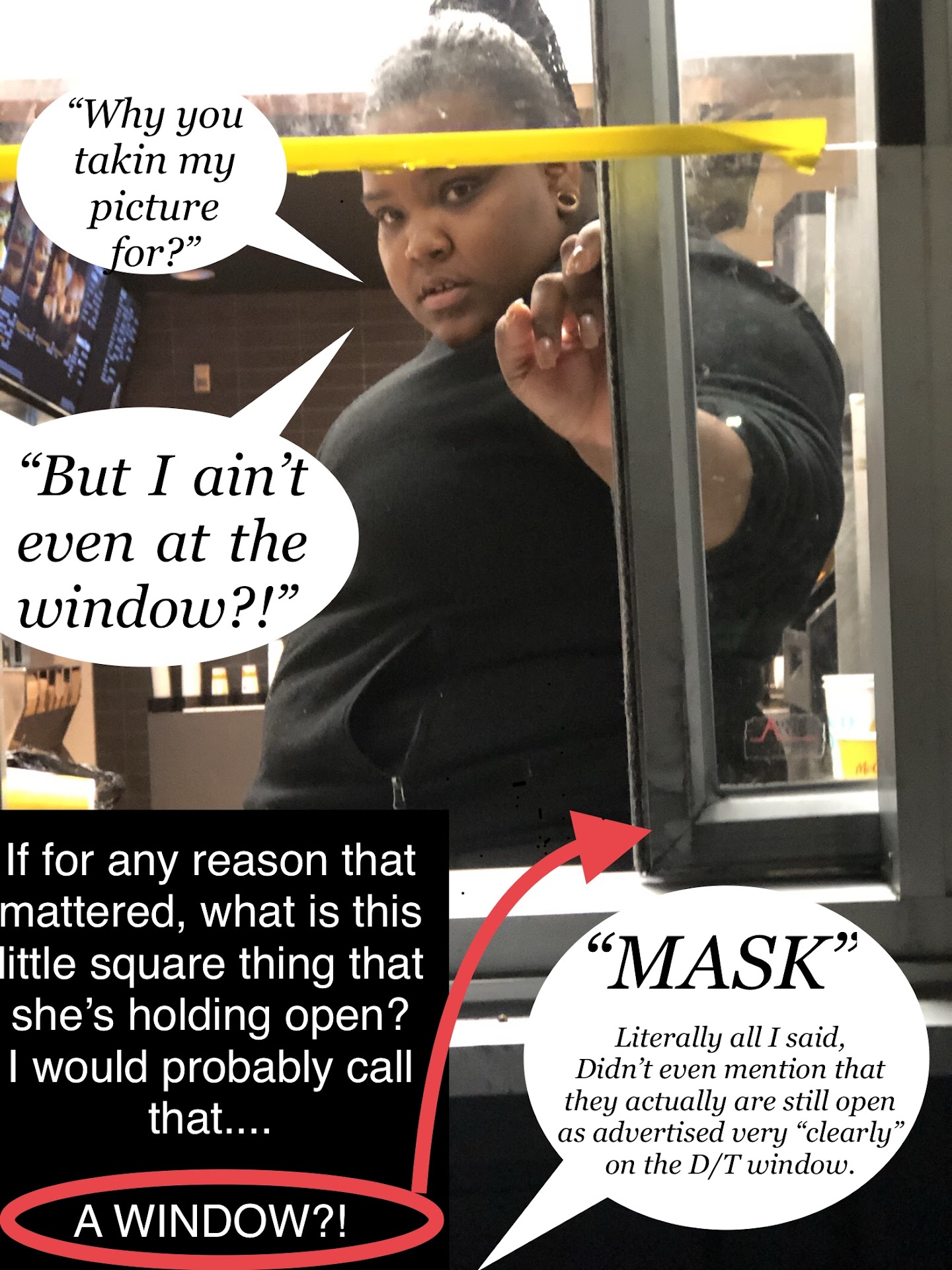 I took a picture of the girl at the window that claimed that the were closed. She asked why I was taking her picture. Because you have no mask on and you are in fact open. Her response was just...
