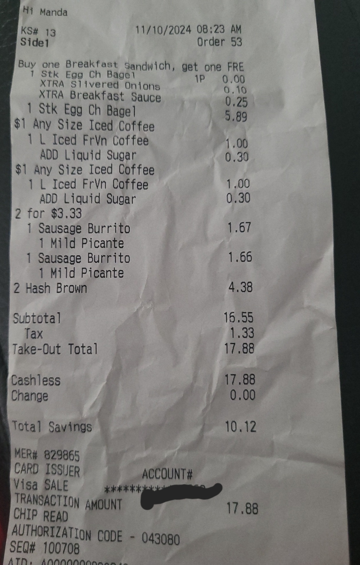 The reason I give 3 stars though is because the two occasions I randomly decided to go inside instead of going through the drive thru like I usually would do, both times, the inside wasn't the cleanest and the staff inside definitely weren't the nicest. It's like 2 different businesses were experiences between drive thru and walk in!! It seriously was like a total 360!
