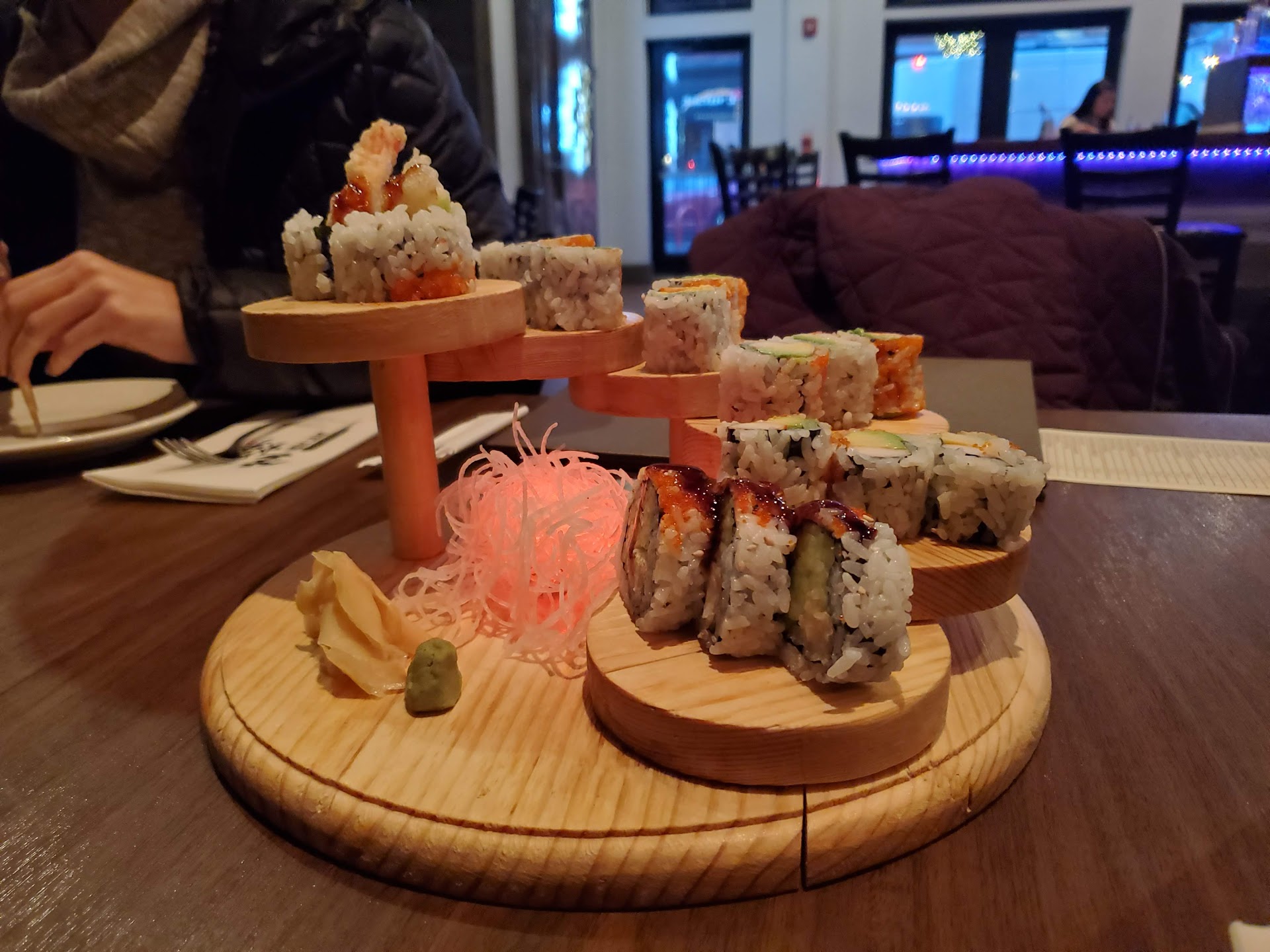 Five of us arrived for dinner. We each ordered a few rolls and I also ordered a small plate. When they were ready, the rolls were dropped off at the table without explanation. It appeared they were organized by the individual ordering, so this wasn't a problem. My roll did not appear to come, but I had my small plate.