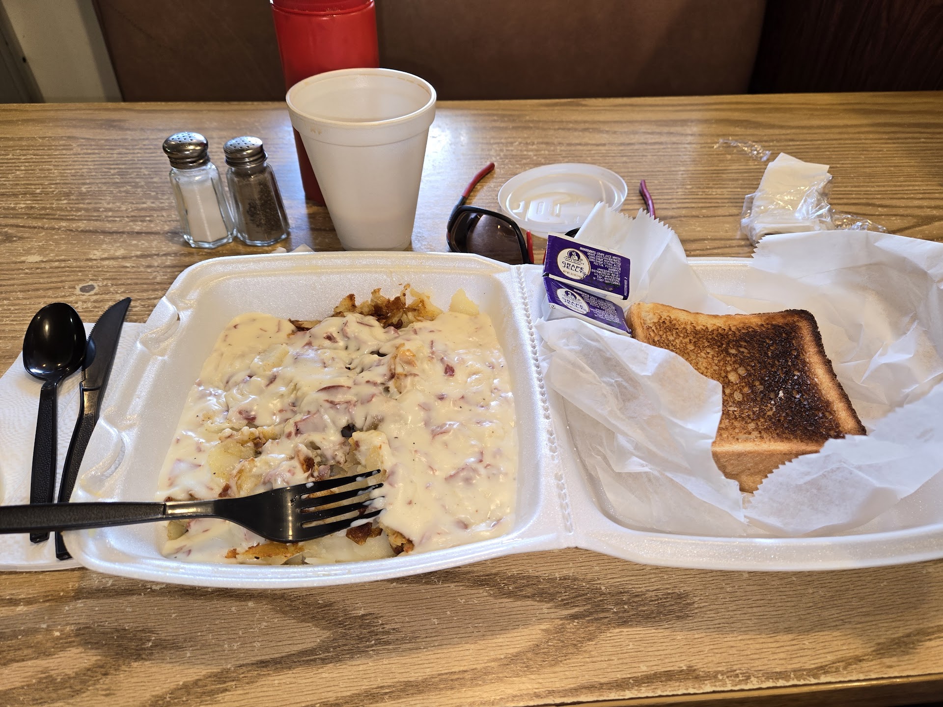 Ā Ā Ā Read moreI chose this restaurant for breakfast this morning to try their "creamy chipped beef" and also because of their reasonable prices. The chipped beef turned out to be some of the tastiest I've ever had in a restaurant. Of course, my own is the best because I brown the beef in butter to coax the flavor into my white sauce. I was quite pleased with both the gravy and the home fries. As you can see, the homefries were nicely browned and sliced thin... absolutely perfect. I thought about a blueberry muffin for "desert" but settled for the side of toast with grape jelly. I got 2 jellies and was offered extra butter, which I love. It was exactly the touch of sweetness I wanted at the end of this meal. The coffee was deliciously prepared, light and sweet. That little bit of caffeine just makes my day start out right. My stomach was fuller than usual, so I headed home for a nap when I finished up. I'm recently retired after 44 years of "nose to the grindstone," 60-hour work week, physical labor. Retirement feels, oh, so right... The ladies who served my breakfast are an awesome team. 3 different ladies took my order and served my coffee, served my food, and got me water (which was ice cold and especially delicious). Super staff all around, front and back of house. The astounding thing I found was that the whole meal was just under $10, and I chose one of the more expensive items on the menu! I want to go back and try their scrapple or an omlette and maybe the hashed browns. Breakfast is my favorite meal to eat out, I may have found my favorite breakfast...