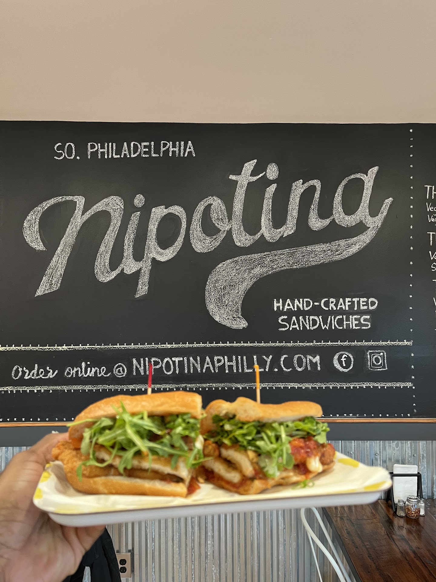 Read moreWe love to try sandwich shops in Philly, and this was our first time at Nipotina. Such a cute place to eat! We were greeted by super friendly staff, who answered all our questions, and was very attentive. I got the P’unk cheesesteak which had delicious fried onion rings on it and smoked Gouda cheese. The roll was seeded, soft and fresh and the signature sauce was spot on! My husband got the Millie hoagie. It was packed with delicious Italian meats and sharp provolone cheese. My son got the Little Louie cutlet sandwich. The broccoli rabe was done perfectly, the chicken cutlets were moist and tender! I even tasted my son’s girlfriend’s vegan cheesesteak, and it was actually really good. We can’t wait to try all the other delicious sandwiches on this menu! I took off one star from atmosphere just because it was super cold...
