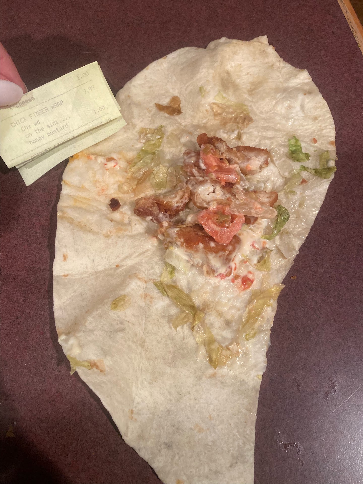 Read moreBeing a VERY loyal customer to Old English for about 15 years this is hard for me to write but NEEDED. I ordered a chicken finger wrap that cost $11 dollars, plus $1 extra for honey mustard the other night. When I opened the box and picked up the wrap, it was already falling apart it felt like there was barely any product in there for such a large tortilla size. I opened the wrap and right away took a picture - the little tiny lettuce there was had shades of brown on it. I had small tiny pieces of tomatoes that tasted old/not fresh. The chicken was chopped horrible, and I asked for extra well but they did not deliver on that either. Lastly barely any honey mustard as I asked for extra.