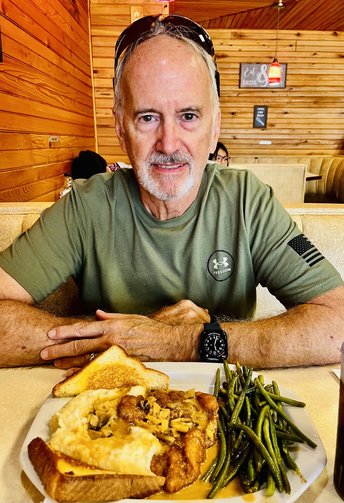 Read moreWe were a tour group of 11 who visited Our Hometown, Philly, in Philadelphia, Mississippi for a late 3pm lunch. Our table ordered steak, pancakes and sauteed vegetables. The steak was ample, old-style Worcestershire marinate, topped with fried eggs - "very tasty". The vegetable selection included: brussel sprouts and asparagus crisped on the outside like parchment with bacon; toasted golden cauliflower florets, fresh handcut sweet potato fries. The most delectable vegetables we had during our trip to MS! Lastly, light fluffy pancakes with strawberries and a touch of powdered sugar. Chefs Adrian and Christina cooked up a fine lunch at a moment's notice for our group of 11. They even had a peanut butter cup cupcake to celebrate our tour leader with '"happy birthday" inscribed in chocolate on the plate and a candle! The three servers were delightful, organized! The staff made a superb meal and we so...