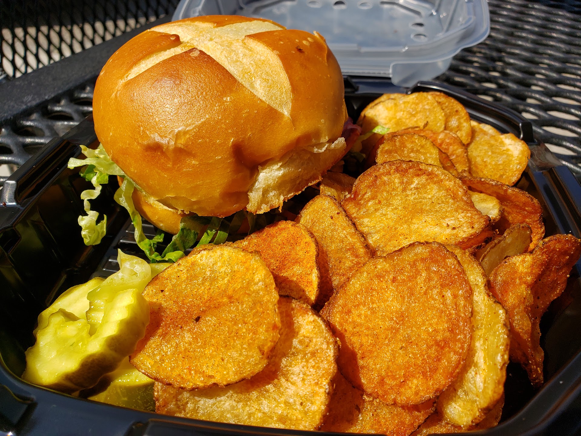 Read moreWe went on open mic comedy night, not knowing about it. We were seated on the other side, presumably because we didn't come for the comedy. Their menu is really only "pub grub", but that doesn't mean bad. We started with their wings, half extra spicy, half mild. They were excellent. We both had the onion soup, which was also really good. He got the bacon cheese burger and I got the chili burger. Both came with hand sliced chips (not fries) which were surprisingly good and far better than a single snack bag would be. He enjoyed his burger, but I liked mine better the next day. The menu had described the burger as being served open faced topped with a lot of chili. There was chili, but it only covered the top of the burger and cheese was on top of that. Still good, but not exactly as described. I had eaten a bit before going, so I took most of the burger home with me along with the rest of the chips. I was quite pleased with the reheated version, I'm assuming because the flavors had...