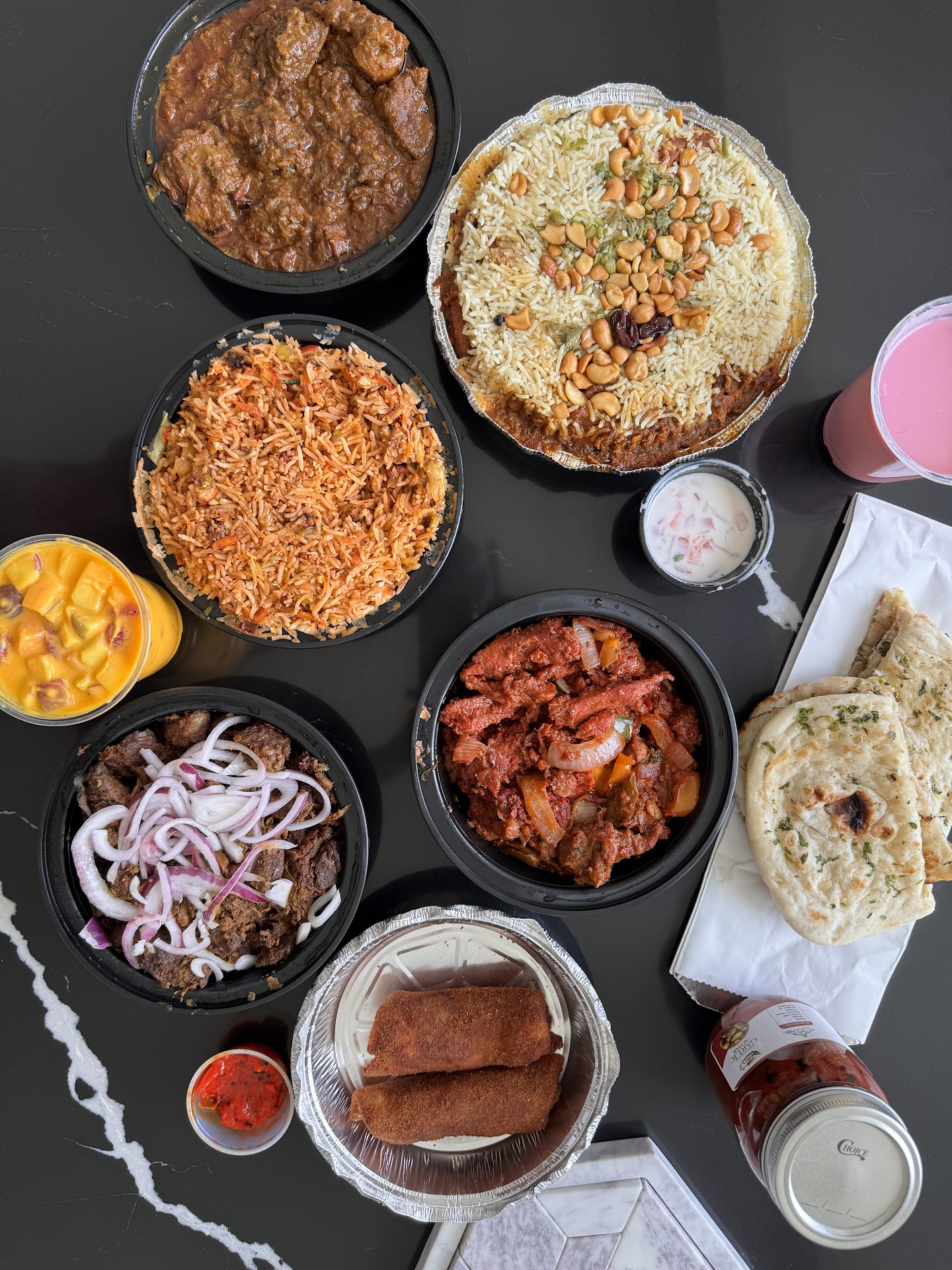 • Dragon Chicken: Flash fried chicken with onions and peppers in a spicy and sweet garlic sauce. • Chicken Schezwan Fried Rice: Spicy fried rice with a savory sauce. • Beef Roll: Shredded beef with Indian sauce and veggies in a roll. • Mutton Roast: Perfectly rich mutton curry, just like homemade! • Garlic Naan: Thick, fluffy, and loaded with garlic. • Kerala Chicken Biryani: Savory chicken curry layered with rice, my second favorite dish. • Filter Coffee: Sweet but not too sweet, just like we love. • Fruit Custard: A sweet ending with fruits in custard.