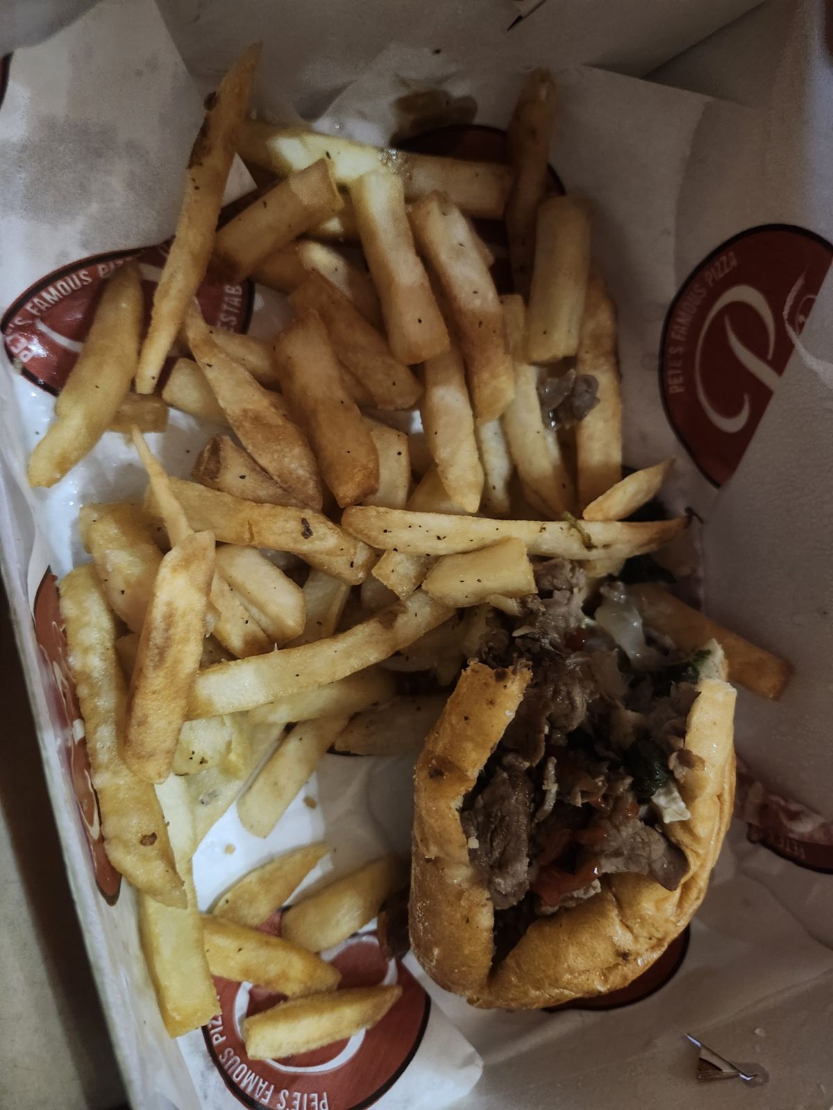 Pete's does some things pretty well but falls short in other ways. To start off with the positives, it has a nice neighborhood atmosphere that seems like a nice place to pop by for a sandwich and a drink. Although I only came by for pick-up, I can see it being a pleasant place to dine in with nice happy hour deals. The service was pleasant and attentive as well as I waited for my order.