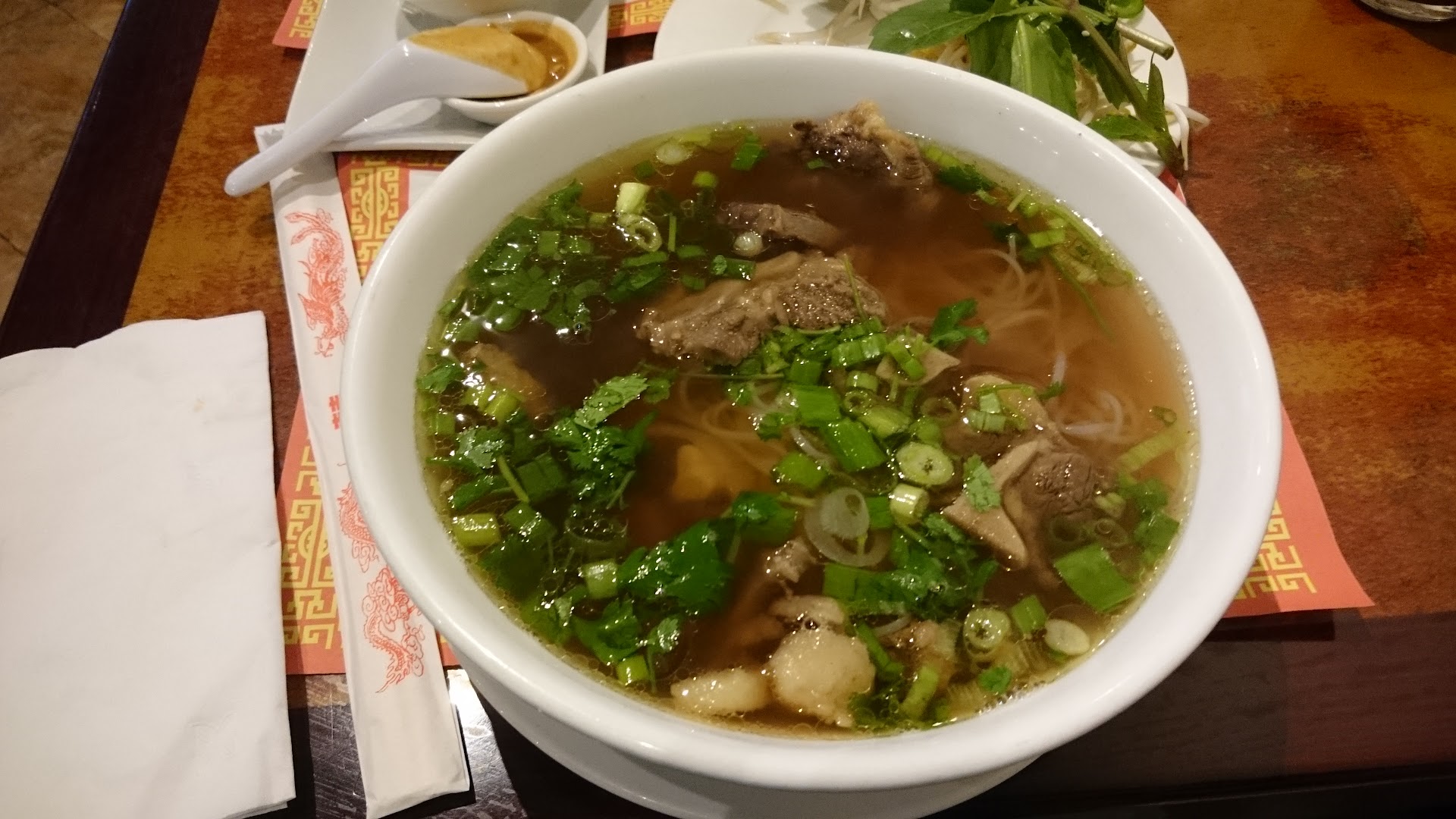 Food Every time I come, there are 3-4 menu items I always get. First, I always grab a bowl of pho of some sort. I usually grab the one with rare steak, well-done flank, and tripe. When eating pho, one of the most important part of the dish is the broth, and Pho Saigon delivers. In most places, the broth tends to be tasteless, but the broth here is one of the tastiest I've ever tried. There are tons of herbs in there as well. Second, I'd get the BBQ pork roll appetizer. It's like the fresh shrimp rolls because it's made with fresh rice wrapper and vermicelli noodles, but instead of shrimp, there are BBQ pork slices inside, which makes it amazing. Third, I often grab the Bánh cuon. It is rice noodles with minced meat inside, and side of pork with fried onions sprinkled on top. Definitely a must try, but a word of advice: it's ONLY offered during the weekends. Lastly, I grab the Vietnamese coffee since I love Vietnamese coffee. There's usually a bunch of ice in it, though. I've had their rice and vermicelli before as well, but they are just average. Their friend spring rolls are really good too! They are sometimes too oily though, but that really applies almost everywhere...