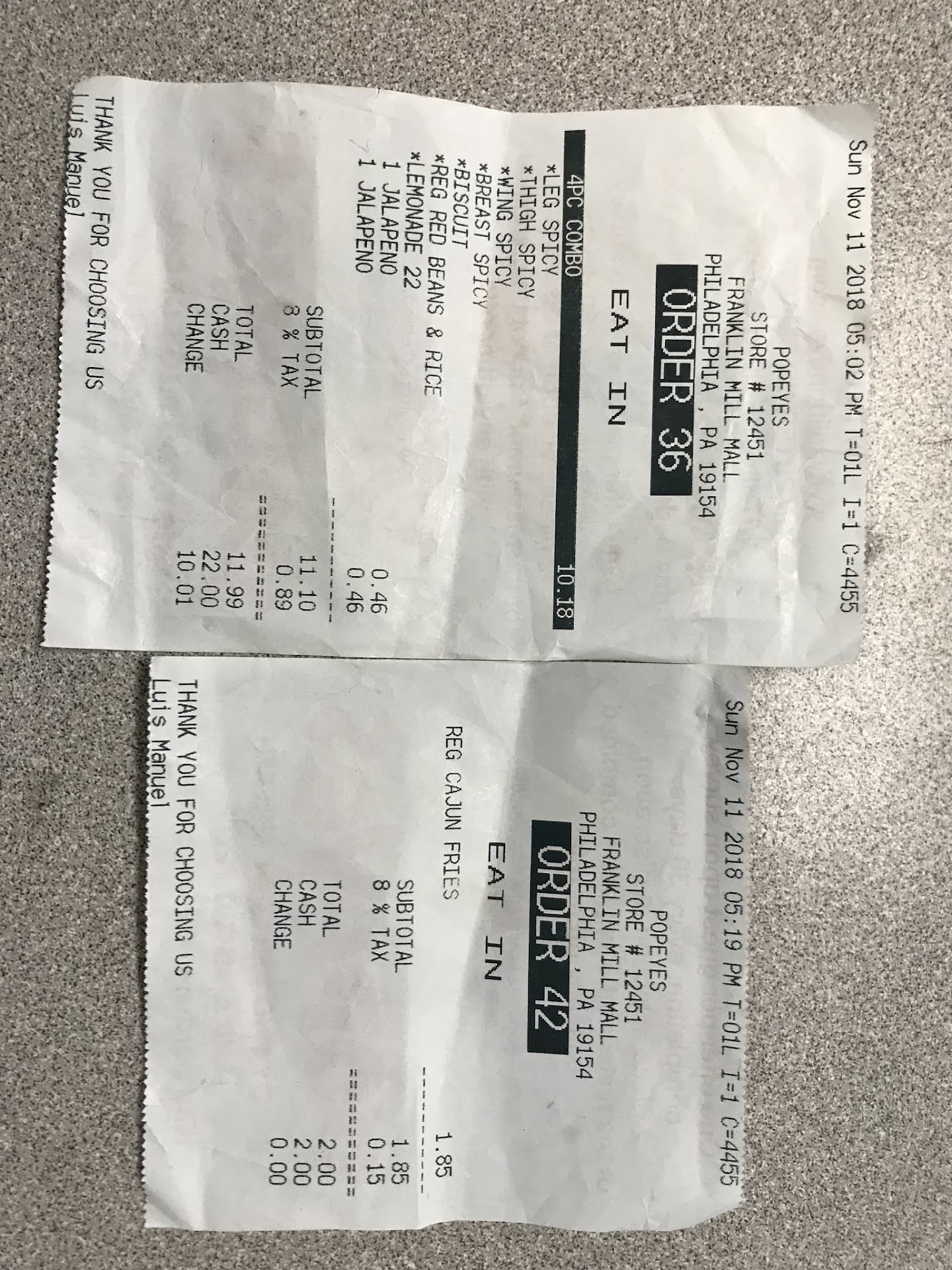 Ā Ā Ā Read moreI recently placed an order online for the Popeye's in Franklin Mills Philadelphia for delivery. I spent $57 for food and some of it was missing. Food was missing from a combo meal that was supposed to be all in one box. Other sides were missing also. How hard is it to read a receipt and place the items in a bag? I'm tired of hearing how overworked and overwhelmed they are. I work hard for the money I spend and would appreciate the items I paid for. If they are shorthanded then the manager needs to be more involved. If you don't have enough people to run things smoothly then cut out delivery/pickup or close the store. The generation today thinks its okay to slack off, not care about anything or think everyone should just accept...