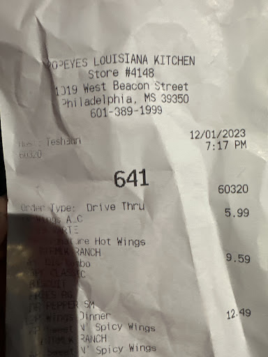 Read moreI actually attempted to come in and order 2 days in a row.. Day 1) Entered the restaurant and stood at the front counter for literally 6 minutes without a single person saying one word to me or even acknowledging that I was there... So I walked out as I only have 30min for a lunch break. Day 2) Entered the restaurant and actually got to order. I ordered one sandwich. I payed and moved to the side... 15 minutes later I'm asking the lady expediting orders...how long does it take to make one sandwich and how much longer is it going to be...so she went and asked someone how to make it and made it herself for me (and that was EXTREMELY APPRECIATED) but by the time got my food I had to run straight back to work and clock in and save the food for later.... it was cold and not great) .... All in all Popeyes, I'm disappointed.... We love the food and I know you guys get busy... But I watched everyone before me and 3 ppl behind me all get their orders while I'm...