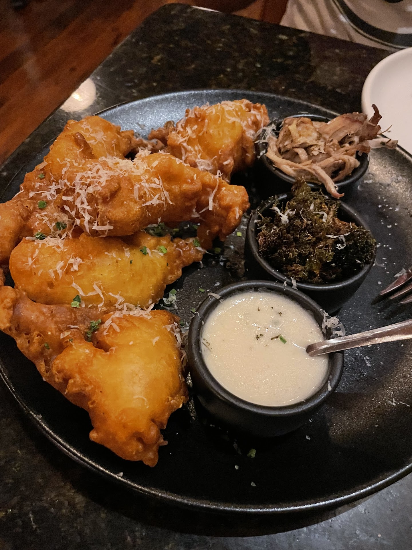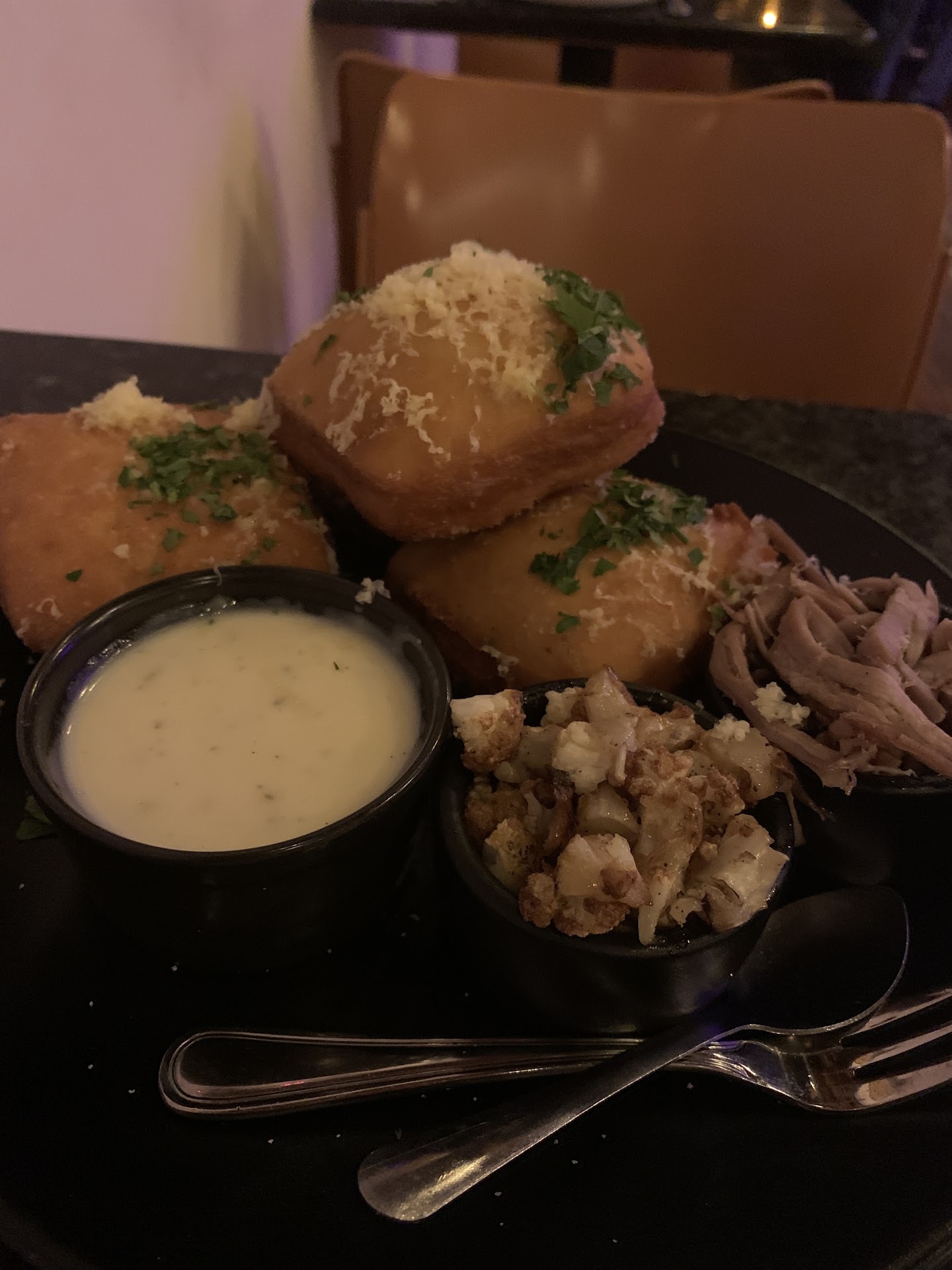 We went with both HH apps: the corn ribs and the white fish dip. The former was pretty good- I don't LOVE corn but the dipping sauce was nice and it was pretty well executed. The latter was much better. Nice chunks of meat with really great homemade chips. We also got the beignets which were the highlight: the melted cheese was excellent and was an addition I wouldn't have expected. The pulled pork and the cauliflower were sort of unnecessary here but still really nice.
