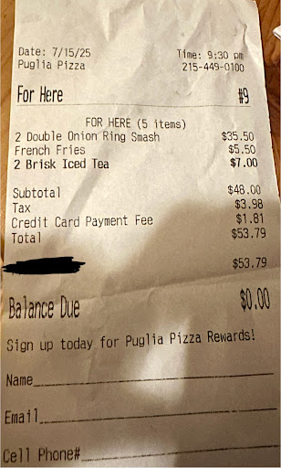 But unfortunately the prices on the menu do not match what I was charged. I ordered 2 onion ring smash burgers ,2 diet cokes & 1 order of fries. Listed on the menu it should cost pre tax $39.50 and was charged $48 pre tax and fees. The onion ring smash burger on the menu says $14 but was charged $17.75 and the Diet Coke was 3.50 listed on the menu as $3, though the guy at the pos rang me up for 2 brisk iced teas. I was in a hurry and didn’t notice until I got home and looked the receipt. But a $8.50 overcharge than listed is concerning. I will be back because this area needs a nice pizza place but I really hope it...