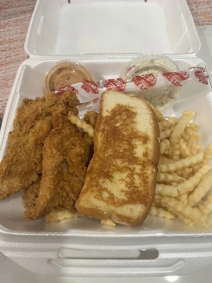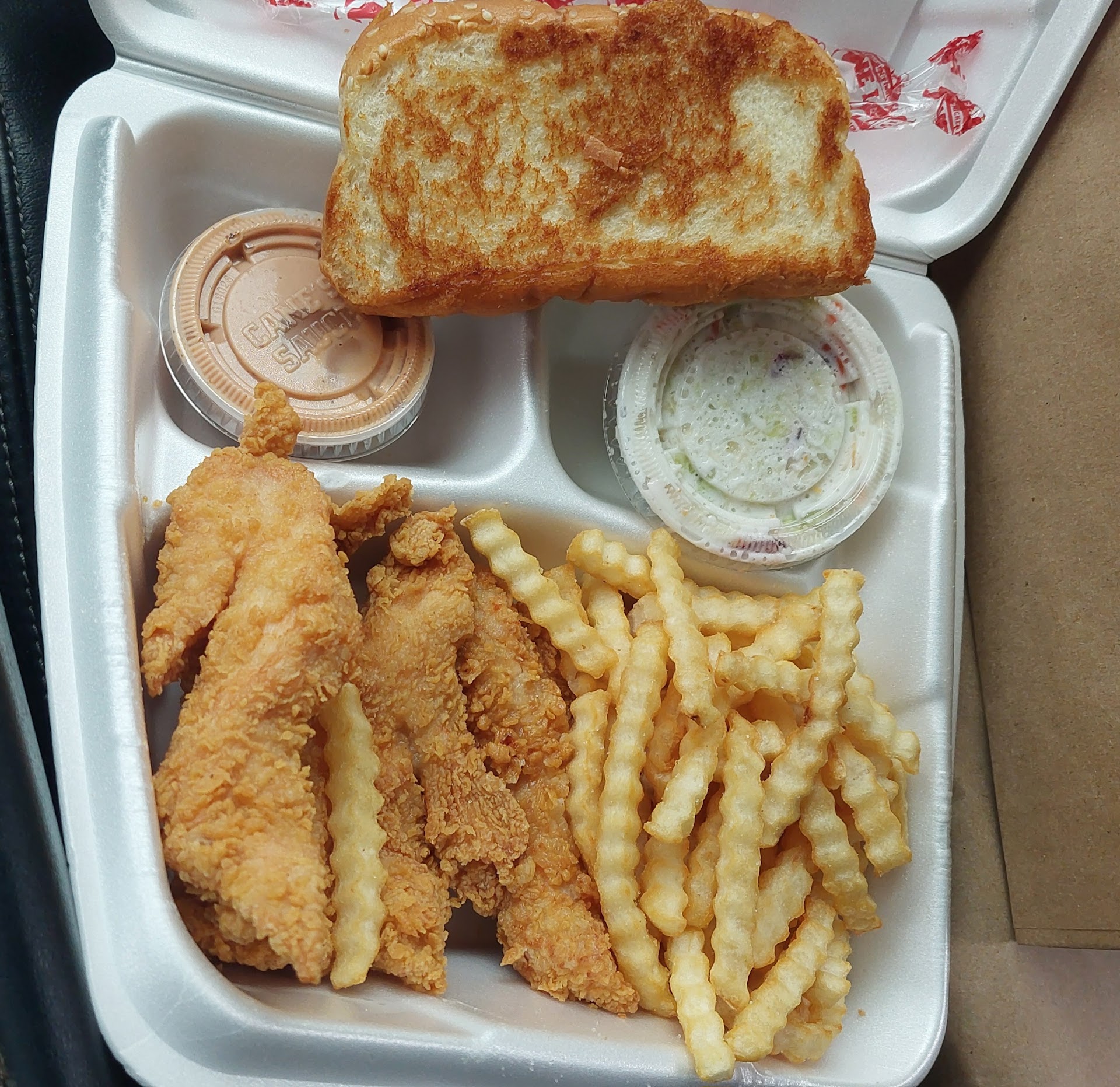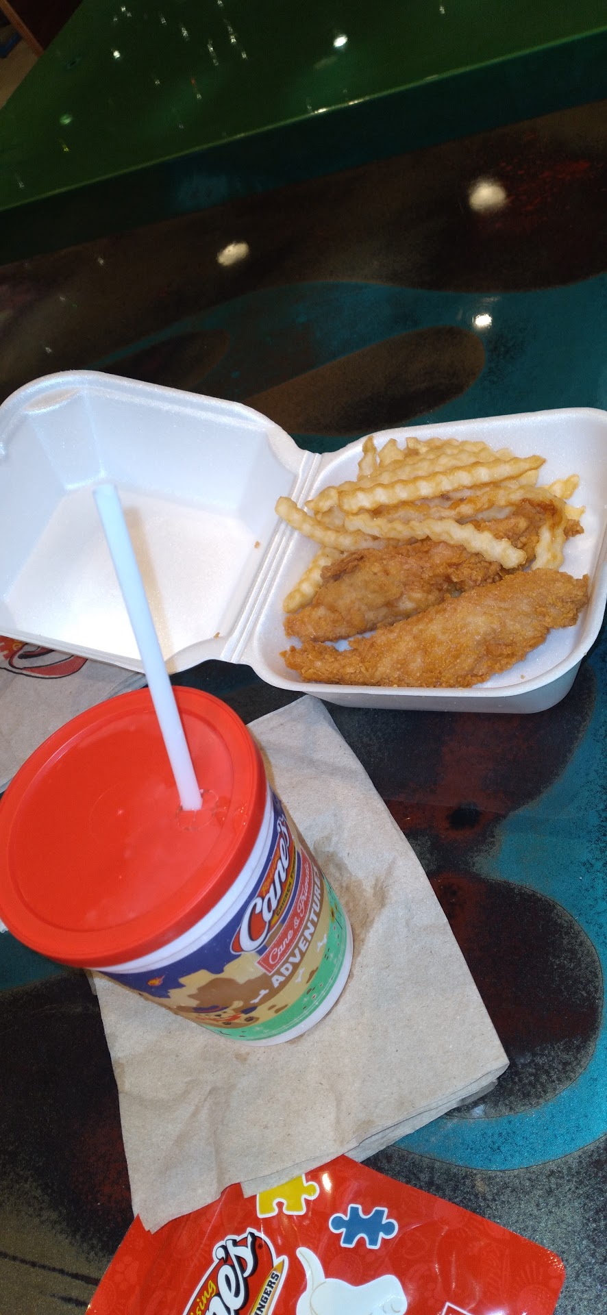 Read moreWent here for the first time and ate inside. The people are so friendly and helpful. The menu is just variations chicken tenders and fries. I ordered a Cole slaw, fries and Texas toast along with a kids meal and drink. My Cousin ordered the chicken tender sandwich with trimmings and extra sauce. If you would like extra sauce they do charge an additional fee. I don't remember but was able to get two for a dollar with change back. The atmosphere is very lively and they take your order and say your name with there moto. It was fun to watch every time they called a name. The place is brightly decorated with big light fixtures hanging from the ceiling as well as large paintings and art. The drive thru was insanely long. The food was fresh, hot and delicious. I would definitely go back and...