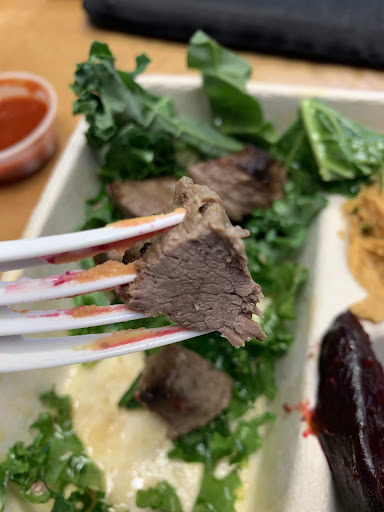 Now onto thee order: First I chose the Grass-fed Sirloin a top a green Spring Mix. Then the Quinoa Salad which had a medley of raisins, parsley & chives embedded into it. Lastly the charred-roasted Broccoli sprinkled with olive oil, parmesan & garlic.