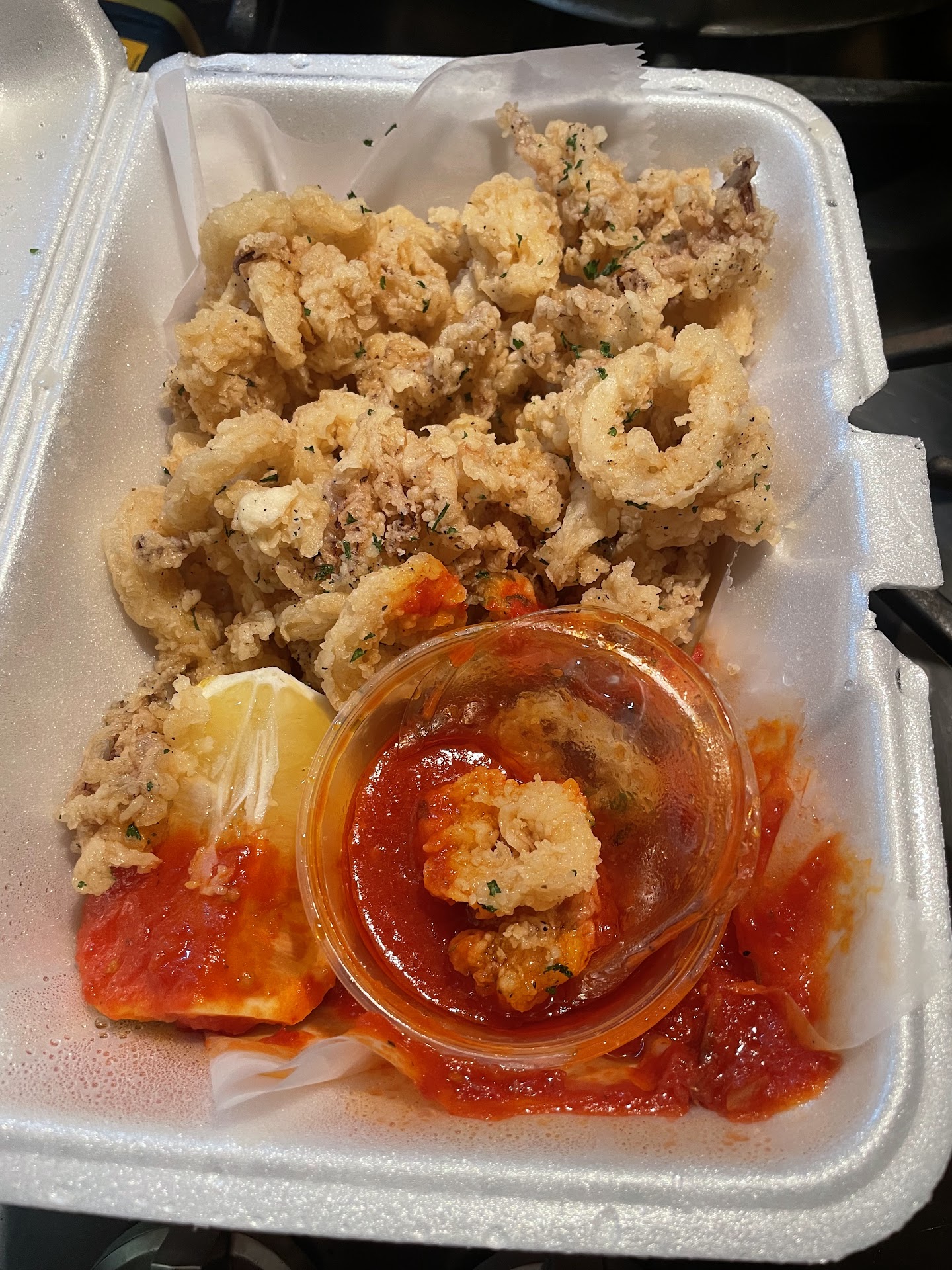 The calamari was hot at one point as was the sauce as you can see from the melted plastic container for the marinara. There was a salad thrown in and a small piece of focaccia thrown in.