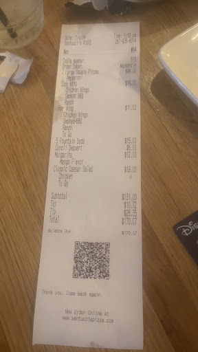 Read moreAs regular customers of Santucci's, North Broad Street, we enjoyed the food and the service was always on point. But that has changed after it's come under new management. While at the North Broad location for dinner we ordered food, that never came. The patrons at the two tables next to us ordered their food at the same time we did, received their food and started paying their bill; we had still not received our order. We had four servers that attended to us, which is odd. After some time another server arrived and asked if we were ready for our check. I said we never received our food and requested to see the manager. The manager came over and from a distance asked what happened. I stated that we never received our food and that the service had been lacking. The manager said, "can't you see that we are busy". I could not believe he made such a statement but he did. The patrons next to us told the manager that they had arrived after us, received their food and were ready to pay. I asked for the check minus the cost of the food. As we waited for the check, I saw our first server printing one out. The check was for the patrons two tables over and they had arrived long after us and the people sitting next to us.