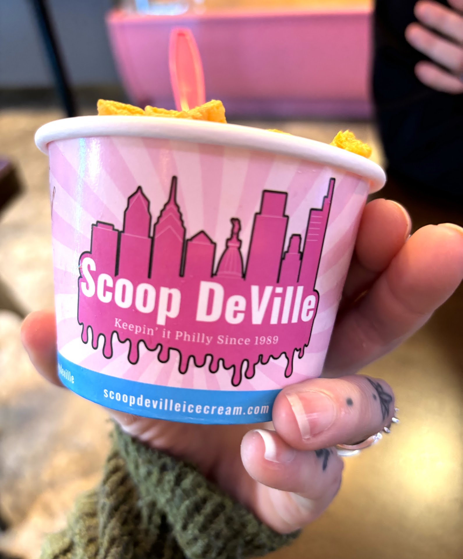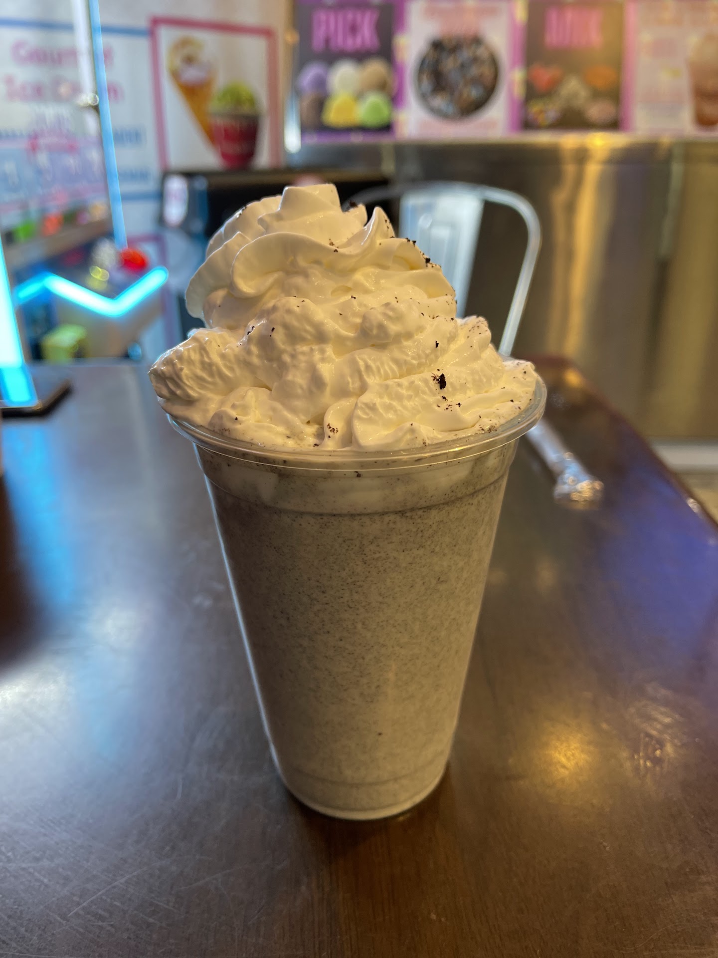 The staff at this location are doing their absolute best: they're friendly, efficient, and patient with kids. I have no complaints with the service here! Unfortunately, Scoop De Ville is not really an "ice cream" shop. This isn't ice cream as most people are familiar with it. It's neither traditional scooped ice cream, nor is it true soft serve or custard. It's... foam.