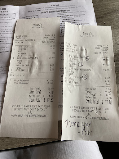 Read morePleasantly surprised by Sharkey's. We were in the neighborhood intending to go to the restaurant across the street but the wait there was over an hour. We walked across to Sharkey's and much to our surprise found plenty of seating available. I can't understand why this place wasn't full. The food was very good and the service was excellent. They have a huge full bar and outdoor deck seating both covered and uncovered.