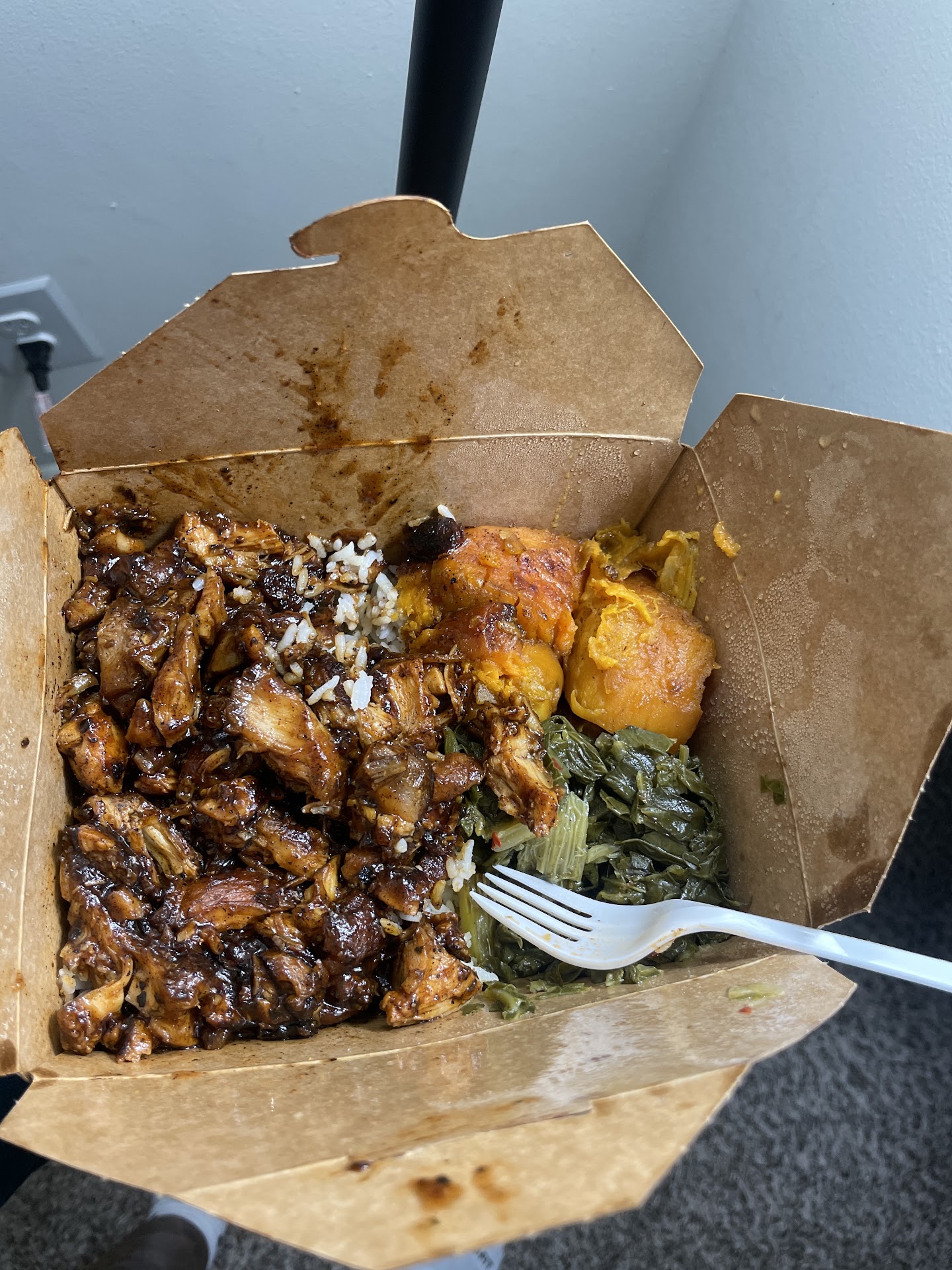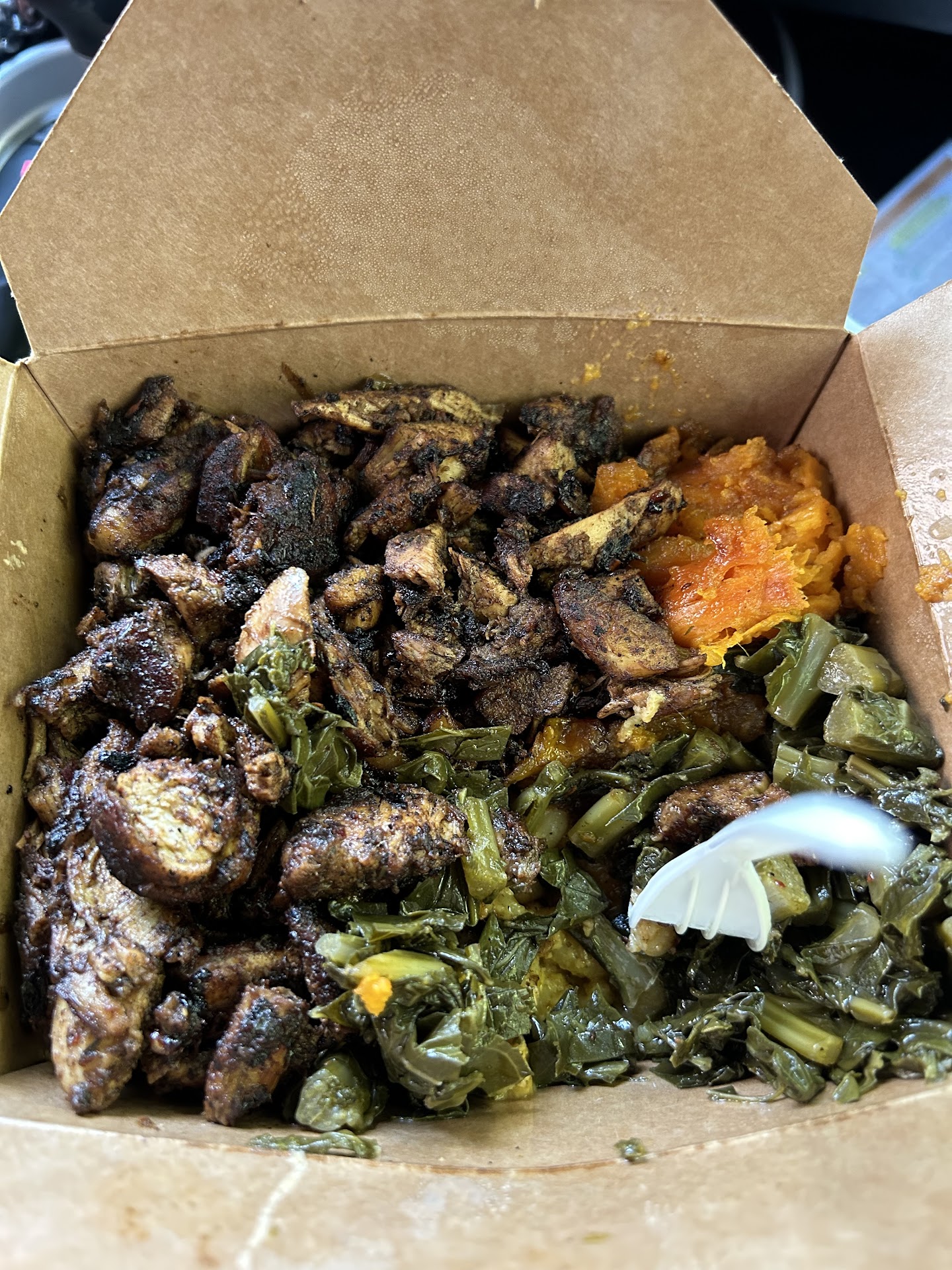 These stars across the board are proudly earned. You are welcomed with polite & enjoyable service then acknowledged even if there is a wait on the food. Be patient; they are busy & everyone communicates so well in the kitchen. The atmosphere is calming & cultural. Now the food- man listen… my blackened salmon was not the “usual” blackened salmon; you taste all the herbs, the rosemary & more- put a hint of lemon juice too.. the flavor is slammin’. I loved the greens & the yams melt in your mouth; now as for the rice , you can legitimately taste the light hint of coconut. I loved it all. Now the Jerk Chicken- flavorful & juicy. This food is made with love from amongst those in the kitchen to spreading the love to all. I will be back to try the Sorrell & Ginger Ice Tea- it was out but I’m truly not surprised after trying their food....