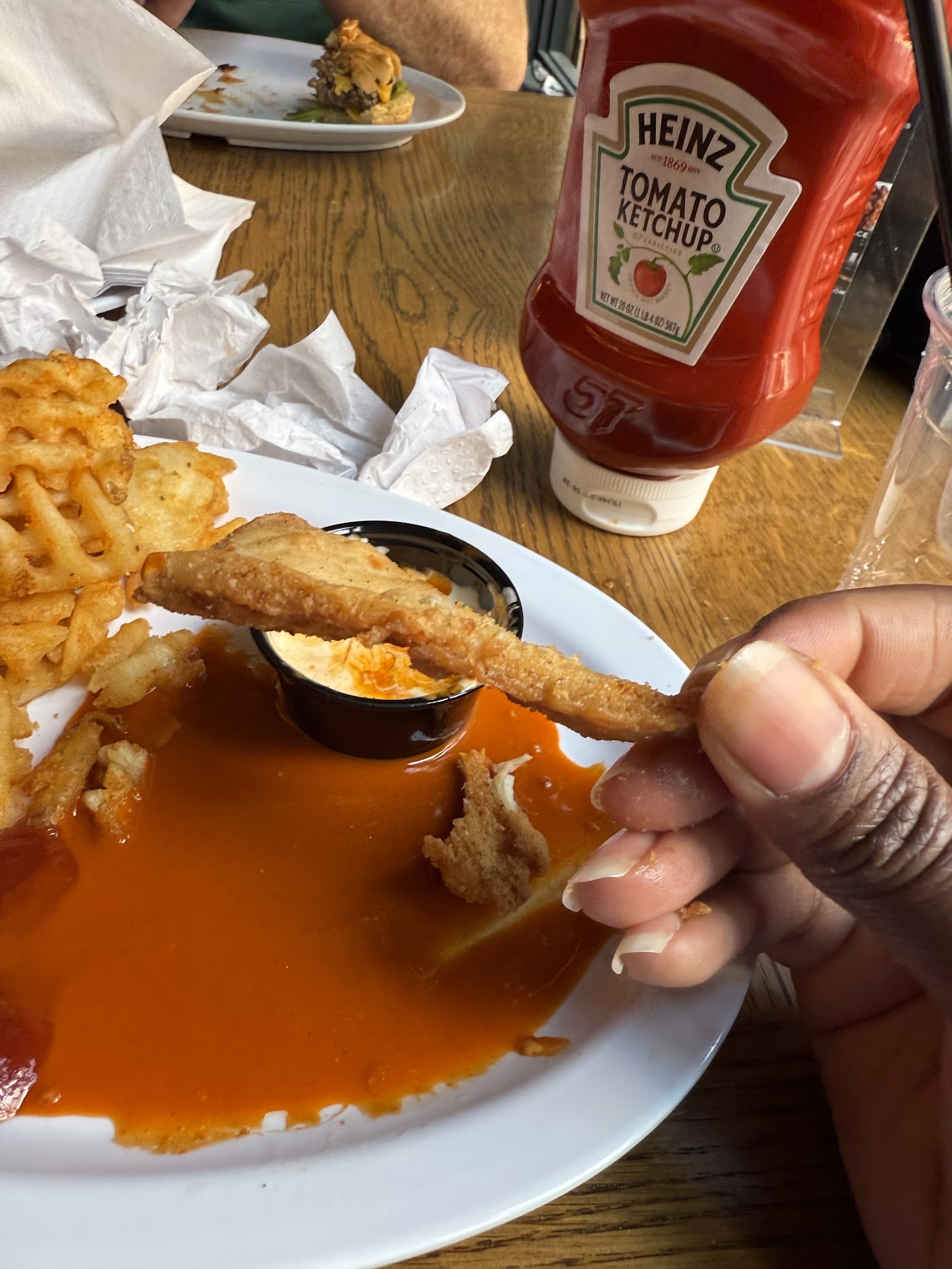I ordered the chicken tenders ($14) which came with waffle fries. THESE CHICKEN FINGERS WERE IMPOSSIBLY, RIDICULOUSLY THIN AND SMALL! The pictures I’m including don’t even do it justice. They were comically small, cartoonishly thin and to add insult to injury, you only get 4 of these chicken jerky pieces. They were so embarrassingly tiny that I commented to my husband “that they don’t even make chicken this small and thin so somebody is back there taking a tiny chicken breast and thinly slicing them to make them even smaller.” They aren’t chicken tenders at all. It’s more like a piece of chicken breast that’s been filleted to the point of transparency and then deep fried.