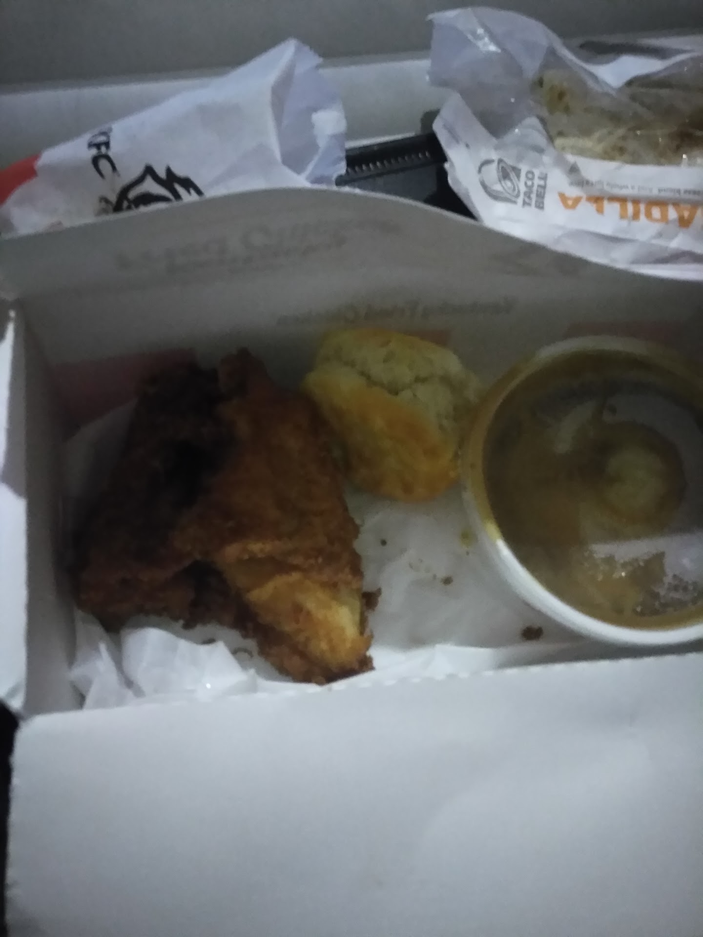 I cannot tell you how the food was there anything else because I had to drive someone here to get something and he wanted chicken and KFC / Taco Bell was out of chicken and yes you read that correctly KFC Kentucky fried Chicken was out of chicken I know that sounds hilarious and I was cracking up in the car because my client was pissed and I could not help but laugh about them not having chicken and he thought I was laughing at him but I wasn't I'm a home health care worker so I don't mean client as in you know sex worker it's a total opposite I help old people okay I help them live so they don't got to go on a home so calm down when you see the word client all right and if you didn't cuz a lot of guys the first thing they see is client and they go boom so I had to make sure I cleared that up real quick but I was in the car cracking up because he was so pissed and he said they ain't got no damn chicken I just couldn't help but laugh how are you not going to laugh at thatso I can't say how the food was really well I could probably tell you how the atmosphere was the atmosphere was horrifying and you know it had a bunch of ignorant ass people giving me dirty looks at a bunch of kids running in and out throwing things at each other and doing dumb shit oh and then the drive-thru didn't work we're sitting there for 17 yes 17 minutes and no one says the word so I say since there's 50 people behind me beeping before I punch one of them in the forehead obviously I'm not talking to anyone so I drove around and then the guy tells me come in it's not working that shows that these are children working here and there should be a sign saying it doesn't work so God only knows what else goes wrong you know when I was a young kid and I worked in places like that the girls that worked there before me they would put degreaser in the oil and make customers sick on purpose and that bothered me because the customers are coming in to get something to eat and you're sending them away with food that's been contaminated and so I couldn't work around that so I I just couldn't do it and so somebody's places you have to be careful with because you never know what you're going to get seriously and you really have to...