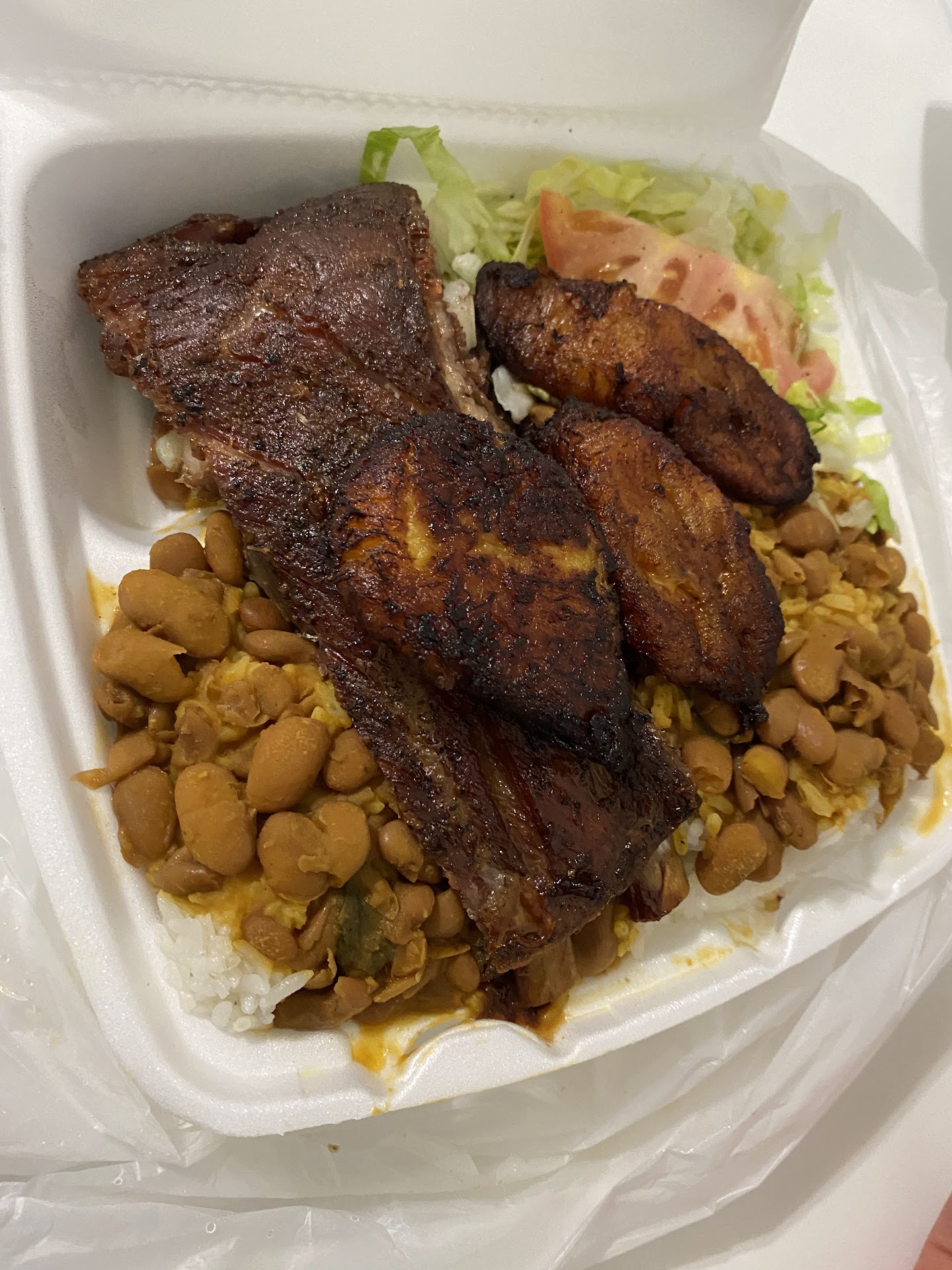 Found this treasure place when I was looking for Dominican/ Mexican food for lunch at work. Really really good slow cook ribs. I really want to know how they seasoned it even there might be some recipes online. When you chewing the chicharrones the juice/fat just come out and it taste really really good. Ribs/ chicharrones(crispy slow cook pork belly), rice and beans, salad, and maduros(sweet fried plantains) for $13.