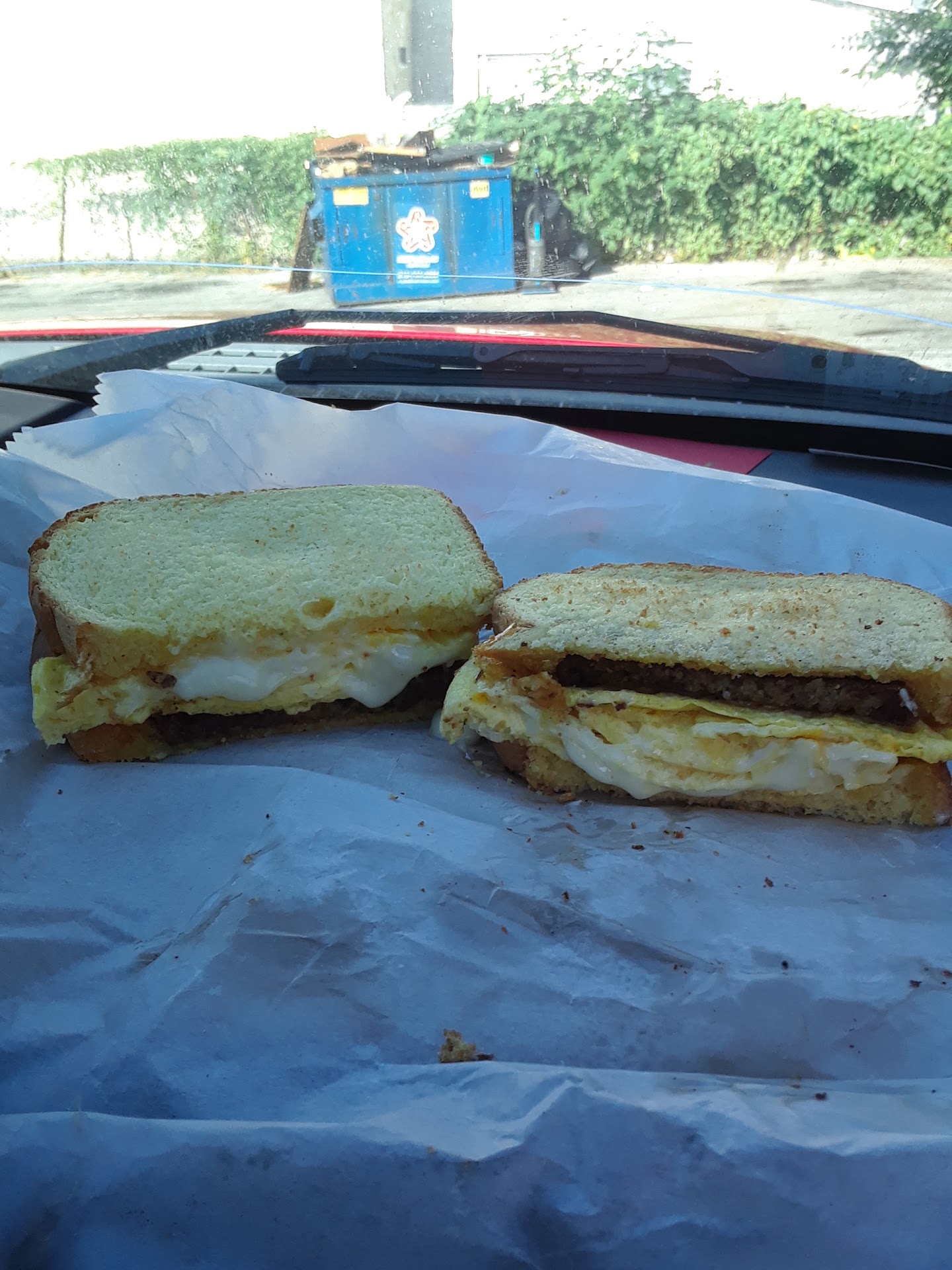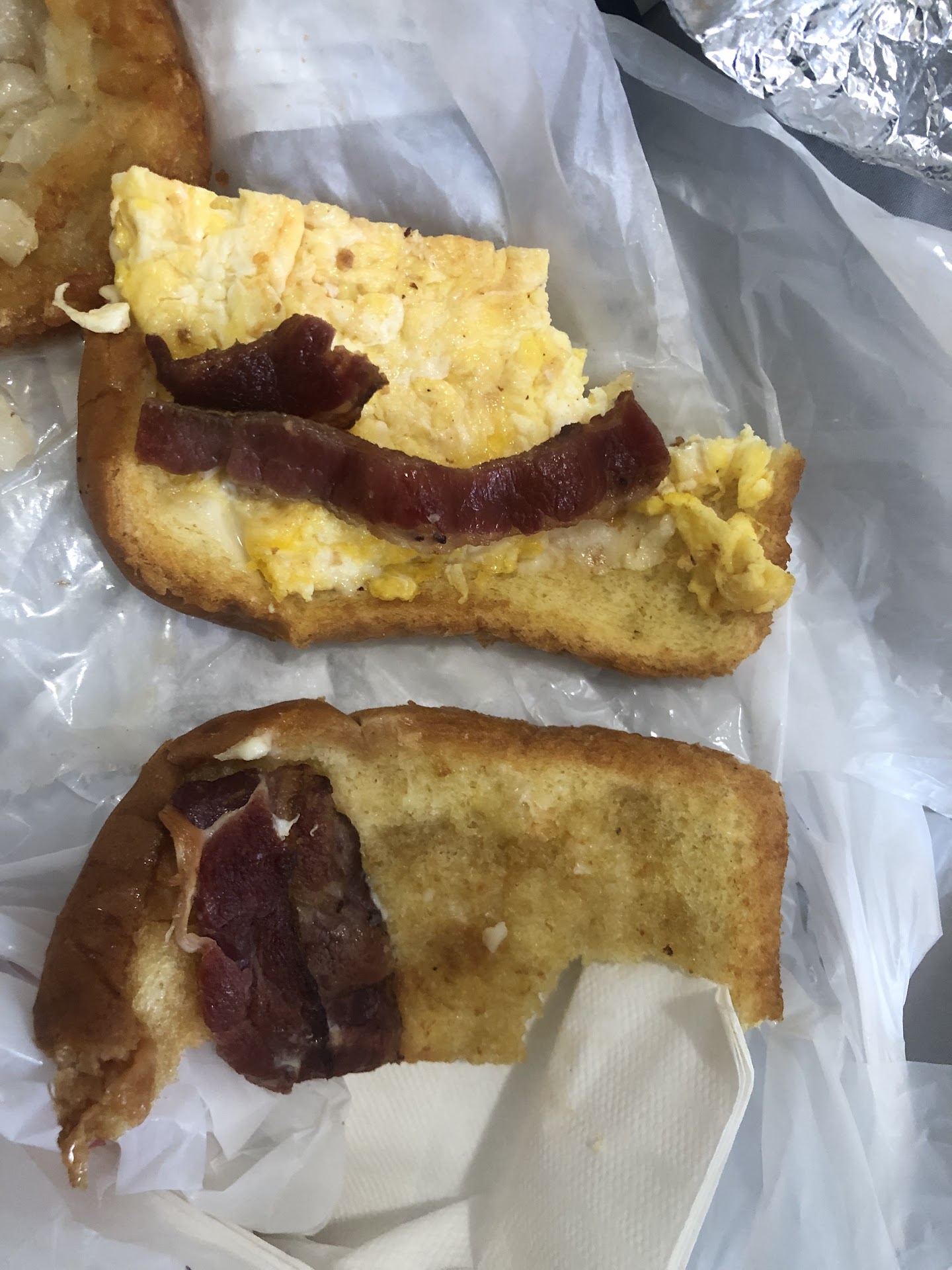 On the inside were 2 slices of extremely chewy bacon that tasted old and the eggs were full of oil.