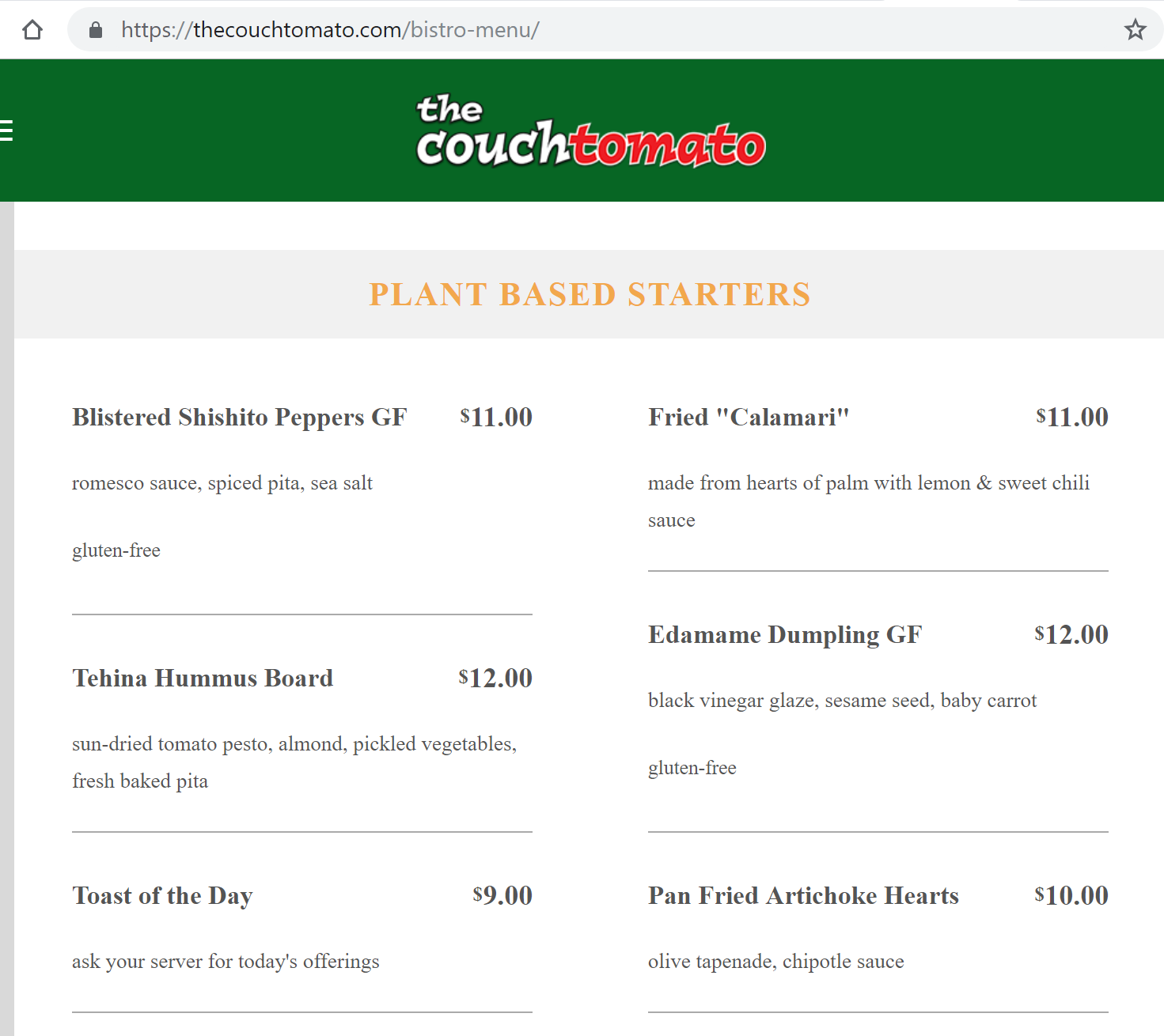 Their old menu offered Gluten Free Pan Fried artichoke hearts, but the new menu doesn't say they are gluten free any more, our server stated that they still were but not marked. We opted to go with the Edamame Dumplings clearly marked gluten free (See attached photo from a screen grab of their web site) to be safe assuming that since marking something Gluten Free on a menu would in fact be Gluten Free. as we ordered this as an appetizer this was the first thing out along with a cheese board. My wife tried it and immediately knew it couldn't be Gluten Free. She asked our server to double check because there was no way it was safe. The server returned with look of horror on her face and say their was a mistake on the menu and it wasn't gluten free... This wasn't a cross contamination, or they made the wrong item for us... their "Gluten Free" menu Item is 100% not Gluten Free.
