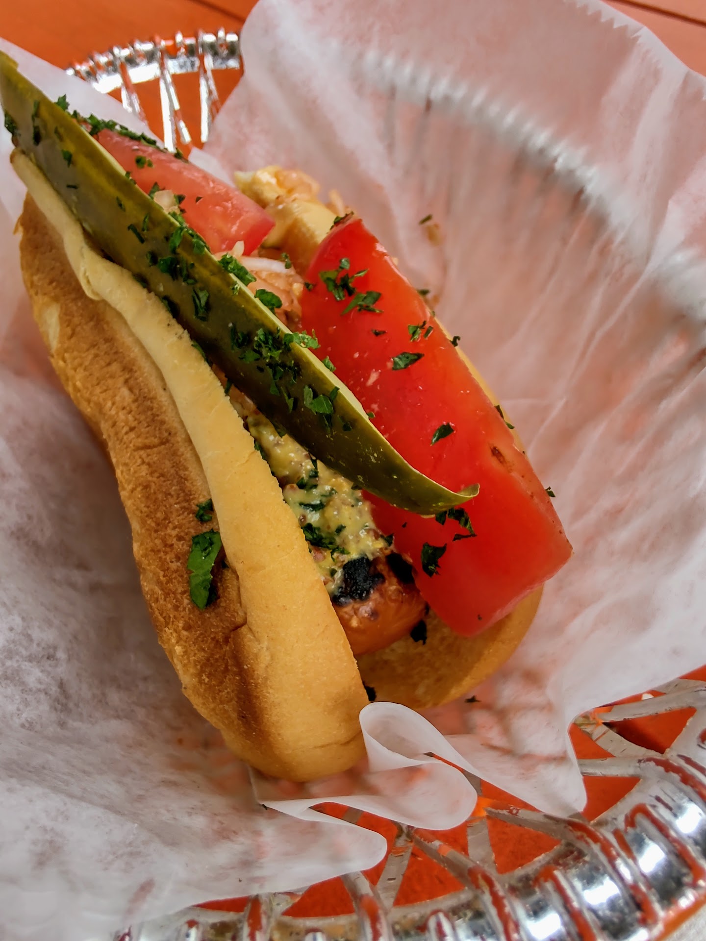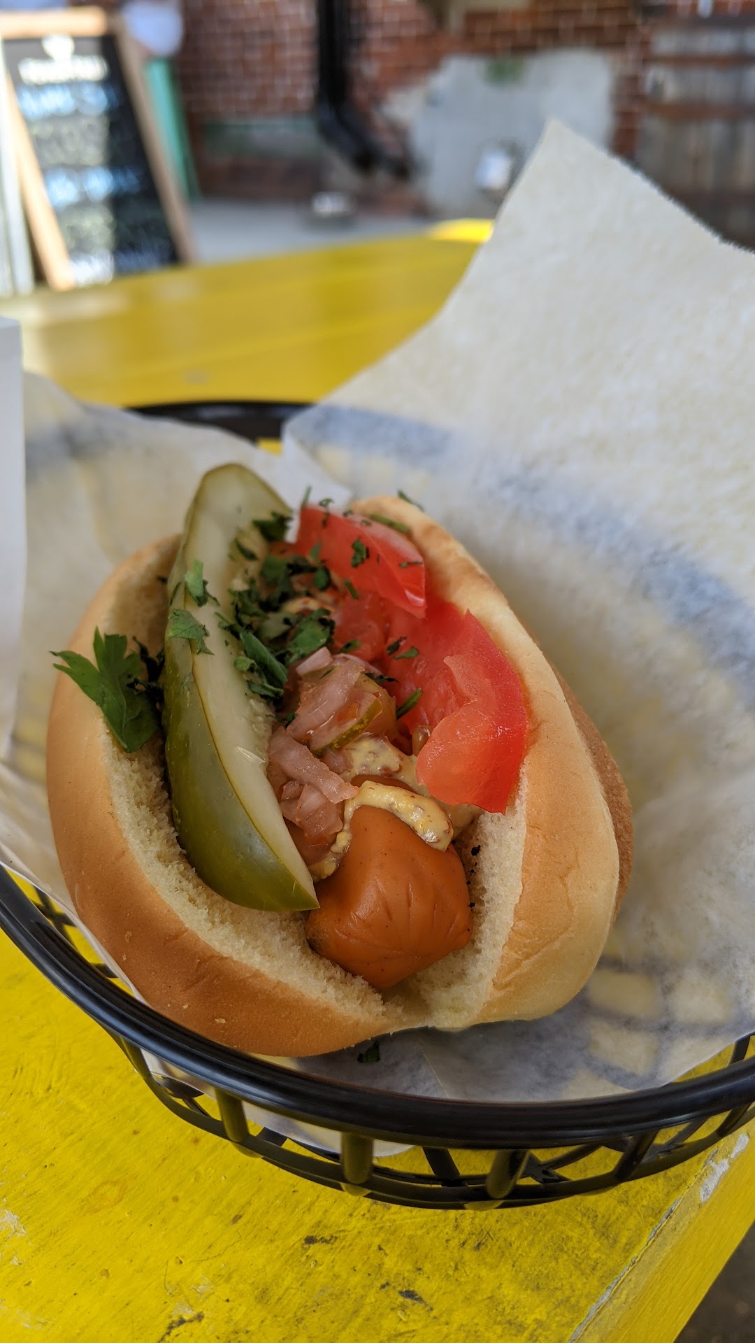 We looked at the menu via the contactless QR code on the table and I went with the Hefeweizen on draft. Much smoother than the beers EG had on tap. My husband got a pony bottle of High Life because why not. We also ended up trying the Chicago veggie dogs. Having been to Chicago in the last 2 years and eaten loads of Chicago dogs, I feel qualified to say this was a good take on it! The only thing I would change is to add the green relish (keep the pickle too!) and tone the mustard seed way down. I teared up a little eating that hot dog with all the mustard seed, haha. Our server checked in on us without rushing us out or trying to insist we should order more -- very chill vibes here. The to-go woman was on roller blades and I thought that was cool.