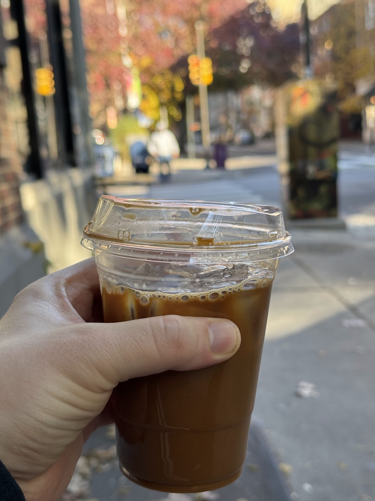 Coffee: 4.5- Good coffee, good price and certainly worth both sitting for a cup or grabbing something quick running to catch the bus. Food: 2.5- EXTREMELY overpriced for most of the sandwiches, which are basically just sliced bread with some (albeit tasty) ingredients in the middle. A bagel and cream cheese is a fine price, and fine, but overall don't come here for food if you are actually hungry. Overall ambiance: 4.5- The big windows on both corners make it a great place to watch people, and keep the cafe very bright. There are plenty of tables for working, or for chatting. It's not crystal clean like some of the newer shops, but I find the little grit exactly what I want in a coffee shop. There's also a large amount of space in the basement (though no windows so very dark down there). It also gets pretty cold in the winter, but that can be excused given the size, frequent door openings, and large windows.