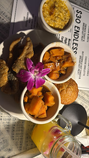I'm going to start this review by saying...the manager comped our entire table...The food was good...very good and that's why this review hurts my heart...we had 1245 reservation arrived early and we're seated...one hour and 5 minutes later we still had no food though customers around us were eating and even leaving (they open at 1230 )...i took my concern to the hostess and she said she would talk to her boss...they came out with the food for one of the 5 guests at our table...ten minutes later no more food had arrived and I called the phone number reached the manager and as he told us he was playing our food I requested he come out and speak to us...during this hour we did get drinks but no other contact from a server or any person...the manager came and immediately cut me off saying I don't have to sell it...i wasn't selling i was trying to give him a clear picture of how this was affecting our birthday celebration for our friend...we were from out of town and our car was parked in a garage and had to be out by 4...we didn't have time to just sit and wait til get started at an endless brunch...but he cut me off to tell us he was comping the entire table...i guess that meant shut up...he said he would get the food out and eventually he did...not correctly but that's the least of the issues...we wondered if they would return to get us more food and eventually they did but it was quite some time ago another hour later he appeared and said he would send the server to get our second order...we were basically finished with this place and worried about the parking situation so we ordered lightly and prepared to leave...they messed up the second set of orders...so we got up and left...this could be a great thing many of the servers were hustling and getting people their food...our server was not attentive nor quick nor caring...i wish we had had a great experience cause as I said the food was good and I would have loved to try some more of it but we had to leave and we left around 315pm...unsatisfied...this is my honest review...do better cause this could...