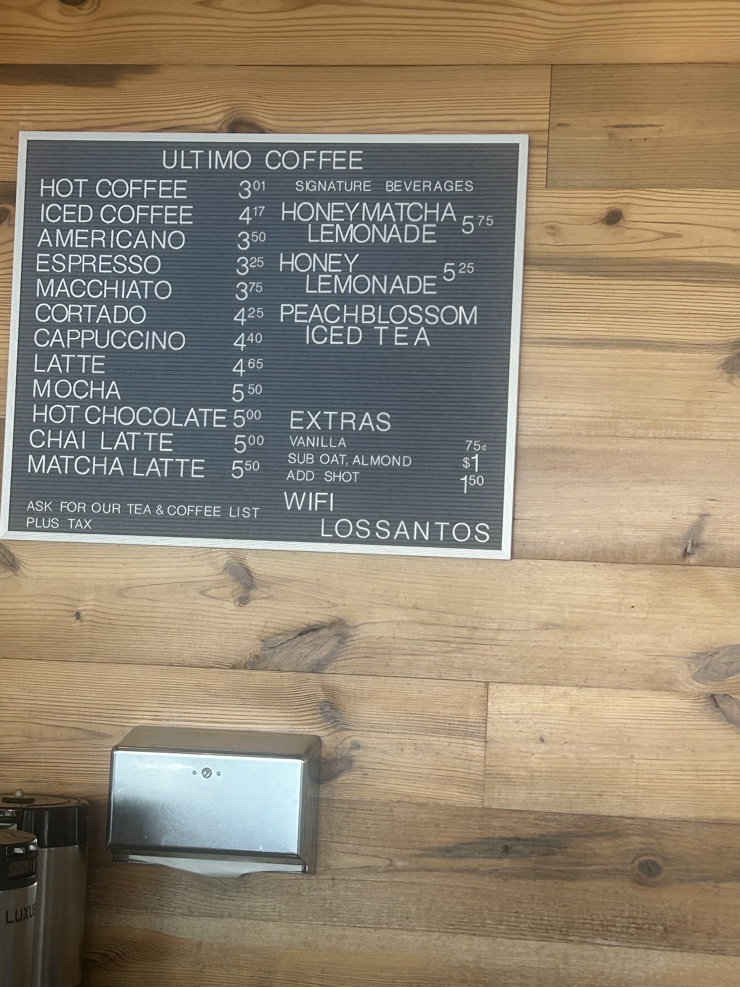 Good coffee, wonderfully efficient & polite service, excellent sweet stuff. Ultimo gets their pastries from Dottie's Donuts several days a week, which almost always sell out, but there are also a few sleepers hidden in the non-Dottie's fare, such as the zucchini bread and apricot bars.