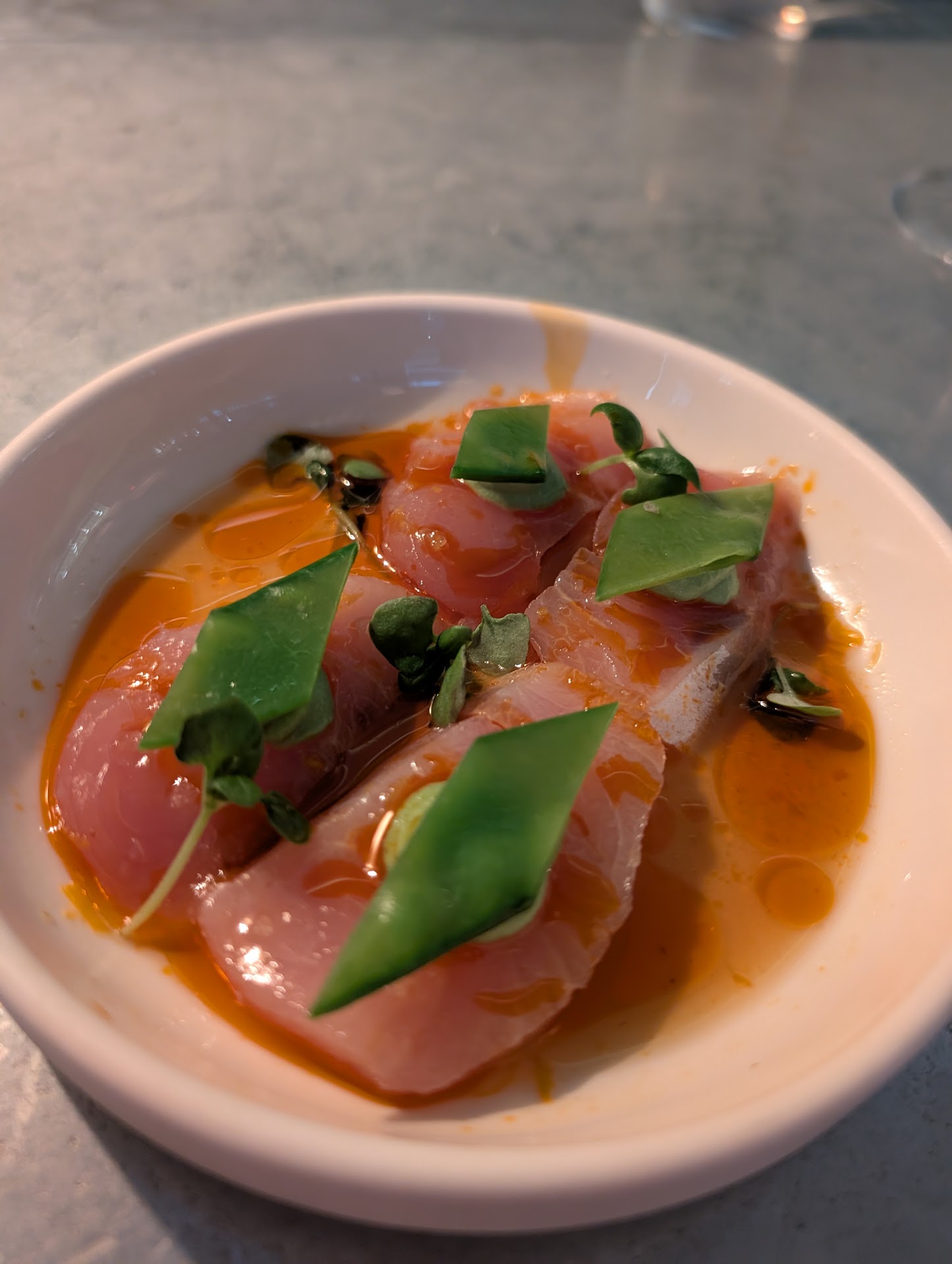 As I mentioned earlier, the food is at its best if you order from the raw bar and small plates. Most restaurants don't ever convince me on oysters but every variety here has been a stunner with clear flavors, quality, and a great assortment of accoutrement that will help you enjoy your oysters however you prefer. The shrimp cocktail is the single best shrimp I have ever had in my life, and blows any other in the city out of the water. It is a MUST try. Finally, the crudos and ceviche are the culinary peaks that really highlight the skill from the kitchen. While all are great, my favorite was the yellowtail crudo which paired a rich and strong slice of fish with tangy yuzu, chili oil, basil, and was balanced perfectly with an amazingly fresh snow pea bite.