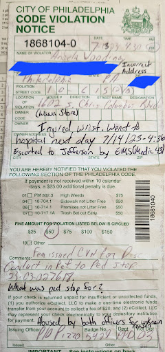 On July 13, 2023 around 4:30PM while visiting this Wawa to grab something to eat, as a citizen, I was informed by both a male store manager and a female Allied Security officer, that I was not allowed to utilize the electrical outlet located in the lobby area. I left my phone there to charge for the duration of my shopping experience. Shortly after, the store manager approached me demanding that I leave the property or he was going to call local law enforcement. I questioned his demands and stated that I would rather wait for Philadelphia PD to arrive. Two male officers, P/O Pizzo and his unidentified partner arrived on the scene 1st and spoke with the store manager/employees, then came outside to speak with me while using excessive force to put me in handcuffs. I specifically requested that I do not be touched until a female officer arrived; however, by that time it was too late and my right wrist had already been injured by the 2 male officers, which I received medical treatment for the next day at Jefferson Hospital (see attached images.) A few minutes later an unknown female officer arrived at the scene, asked me what happened and offered to escort me and my belongings back to Headquarters, in which I was in full compliance with. After being processed, the 2 male officers issued me a Code Violation for alleged disorderly conduct in refusal(s) to pedestrian stop (see attached image.) Still til this day, I question what exactly was I being stopped for, especially after the Hispanic/other, female, Allied Security officer stated if I needed assistance with paying for food/drinks, just ask and she would cover the cost. In a situation like this, how does the public and private sectors come together to help better the less fortunate? On top of that, what is the city doing, as a team, about the constant police brutally that we, the people,...